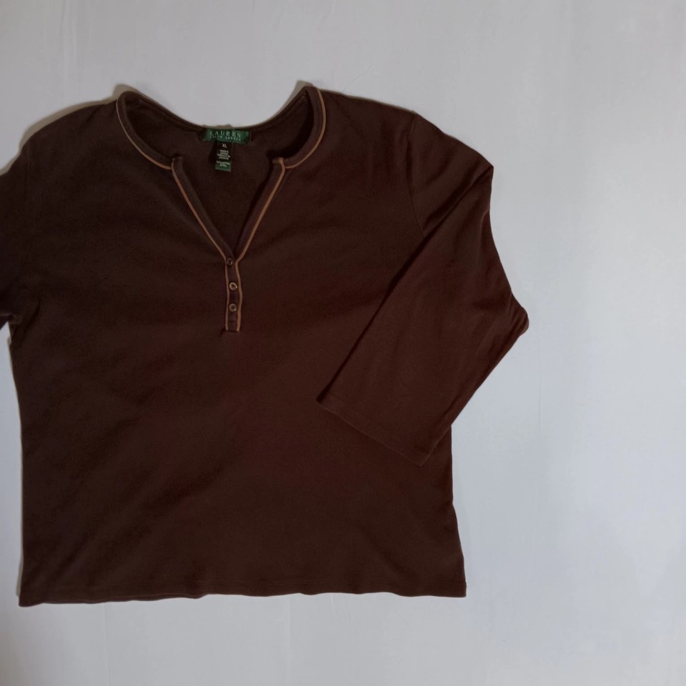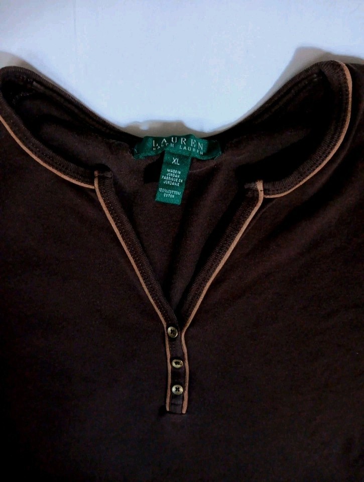 This Women's XL Long Sleeve Top is a classic pullover shirt made of 100% cotton in a solid brown color. Featuring a mock neck and 3 button accents, this casual top by Ralph Lauren offers a comfortable regular fit. With its easy-care material and basic style, this long sleeve top is a versatile addition to any woman's wardrobe. Normal wear.