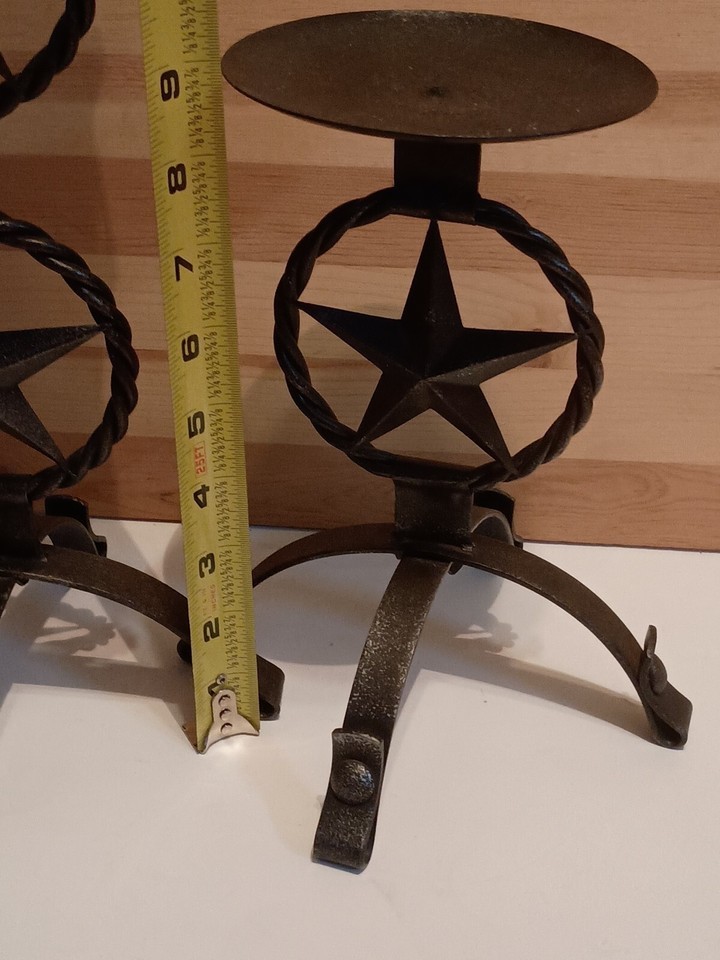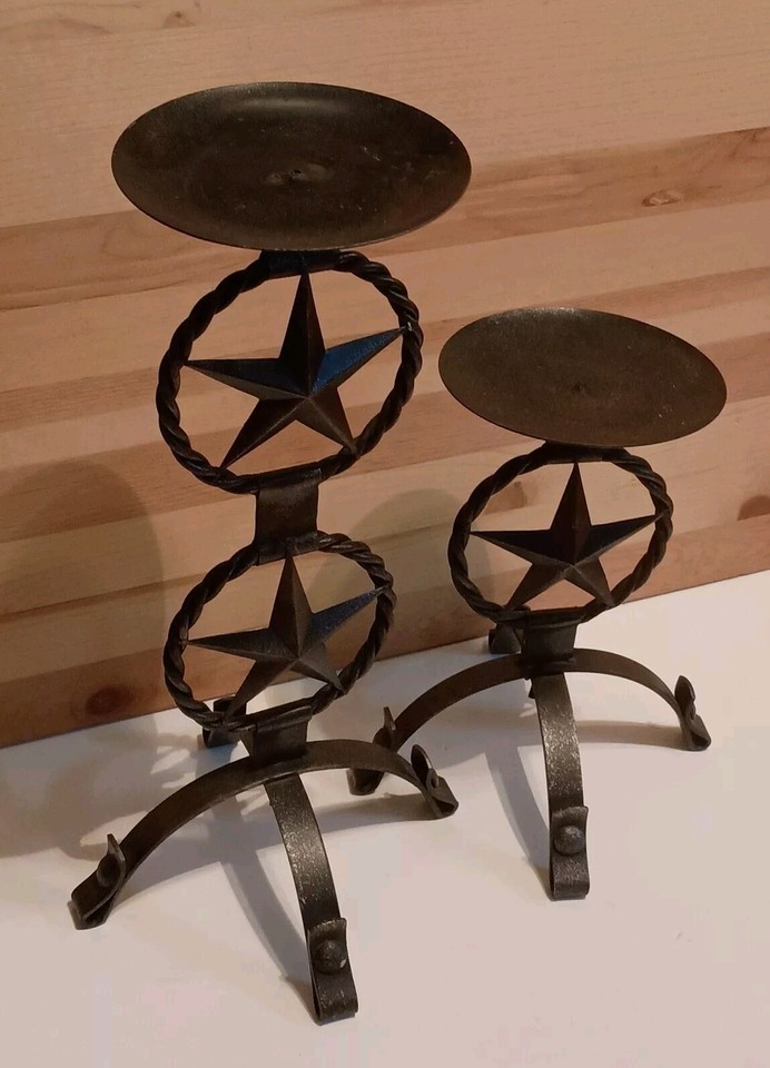 Add a touch of western style to your home decor with this set of two metal candle holders. These pillar stars are perfect for any lodge or rustic setting. The medium-sized candle holder measures approximately 13.5 inches in height and 7 inches at the base, while the smaller one measures 9 inches in height. The brown color and metallic finish give these candle holders a unique and stylish look. Made for candle lovers, this set of two candle holders is suitable for any occasion. Whether you're hosting a dinner party or just relaxing at home, these candle holders will add a warm and cozy atmosphere to your setting. So, add a touch of western charm to your home decor with these beautiful candle holders today! Normal wear. See pictures.