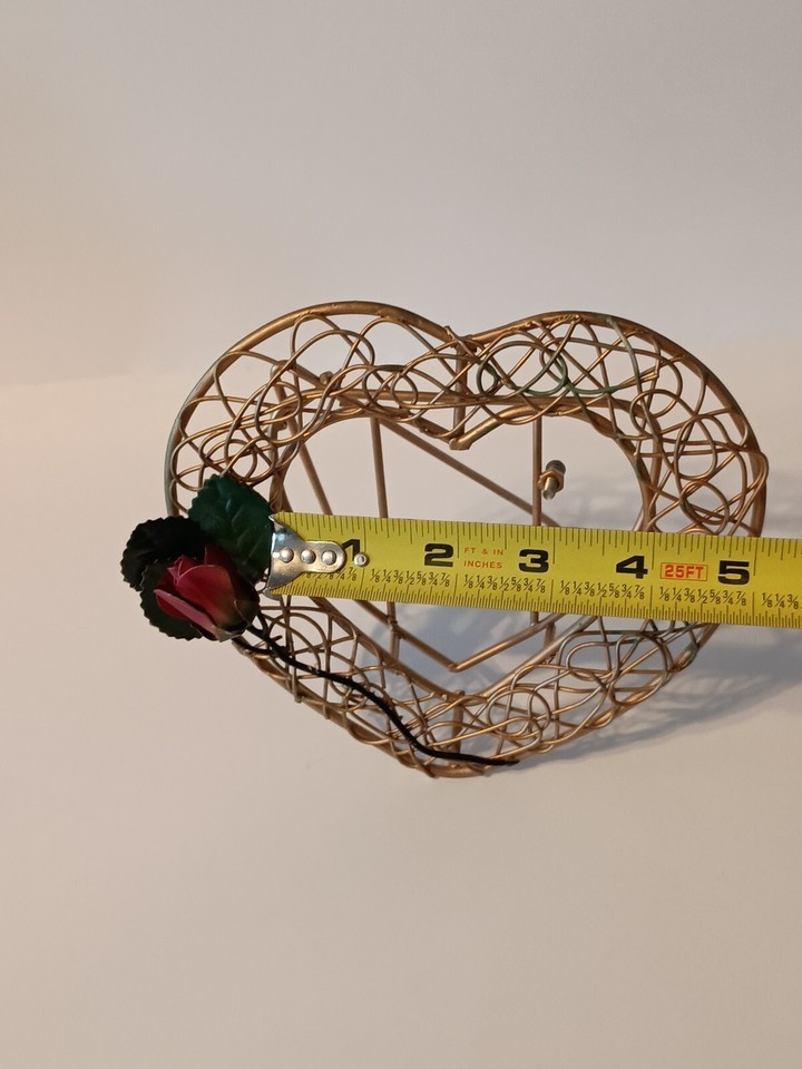 This Gold Metal and Wire Heart Shaped Picture Frame is a modern and cute addition to any home decor. With a unique design featuring hearts and a stylish gold color, this frame is suitable for holding a 4x4 photo. The frame is made of metal with a heart shape, measuring approximately 5 1/2" in height and 6 1/2" in width. Perfect for displaying a special picture in a charming and elegant way. Normal wear.