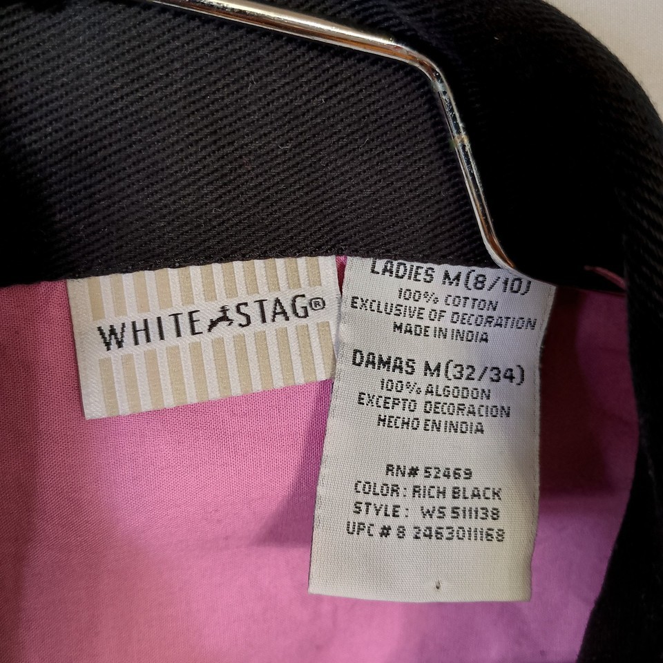The White Stag Ladies Jacket in size M (8-10) is a stylish and versatile piece perfect for casual occasions. Made of 100% cotton with a chambray fabric type, this mid-length jacket features rich black color with intricate multicolor floral embroidery, giving it a boho, hippie vibe. The bohemian style, along with the button closure and regular fit, makes it a comfortable and fashionable choice for all seasons. Perfect for adding a touch of Americana flair to your wardrobe, this jacket from White Stag is a standout piece that will effortlessly elevate your look. Normal wear.