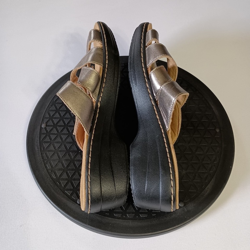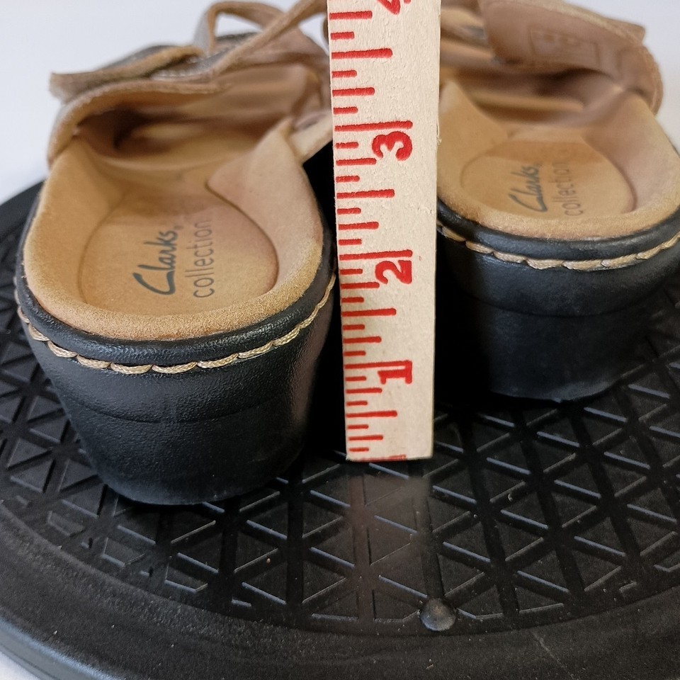 The Clarks Collection Women's Slip-On Sandals in size 9 are a stylish and comfortable choice for casual occasions. Made of leather with a metallic gold color, these sandals feature a slip-on closure for ease of wear. With a mid heel height and wedge heel style, they provide both support and comfort for all-day wear. The open toe design and adjustable strap add to the overall convenience of these versatile sandals, perfect for the summer and spring seasons. Made by the reputable brand Clarks, these sandals are a fashionable and practical addition to any woman's wardrobe. Normal wear.