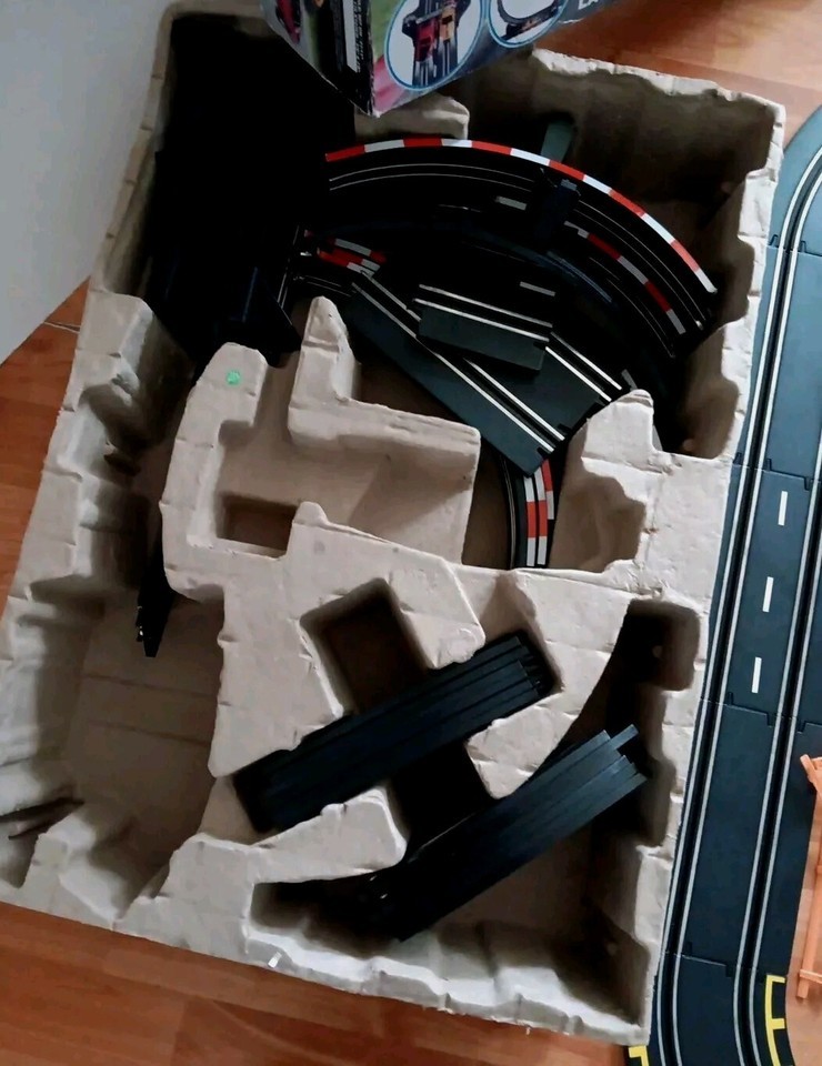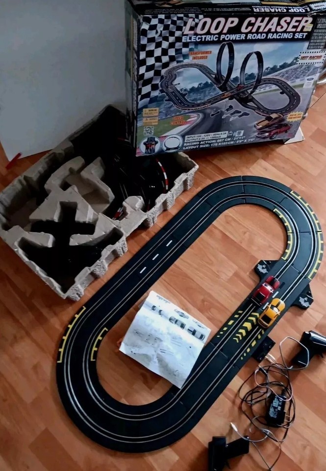 The product is a GB brand slot car electric race set that includes two slot cars in an incomplete set. The model is called Loop Chaser, designed for children aged 8-11 years old. This set is missing some components but has been tested and is in working condition, providing an exciting and fun experience for kids who enjoy slot car racing. Perfect for young enthusiasts looking to challenge their friends in a thrilling race. Normal wear
