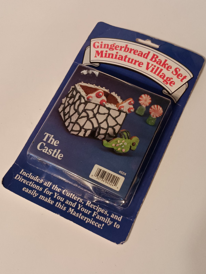 This vintage Fox Run Craftsmen Gingerbread Bake Set includes miniature village cookie cutters, featuring a castle design. The set is made of silver metal and is reusable, perfect for creating gingerbread cookies for Christmas. The cookie cutters come in various shapes, adding a festive touch to your baking creations. Made in the United States, this collectible item from the past brings a nostalgic charm to holiday baking traditions. NOS, New old stock with some wear to the packaging, See pictures.
