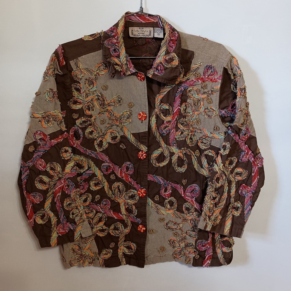 Vintage Life Style Woman Button Up Jacket Size 3X Brown w/Multicolor Embroidery