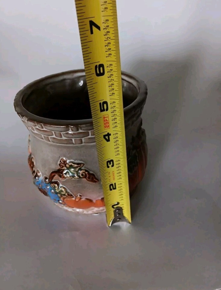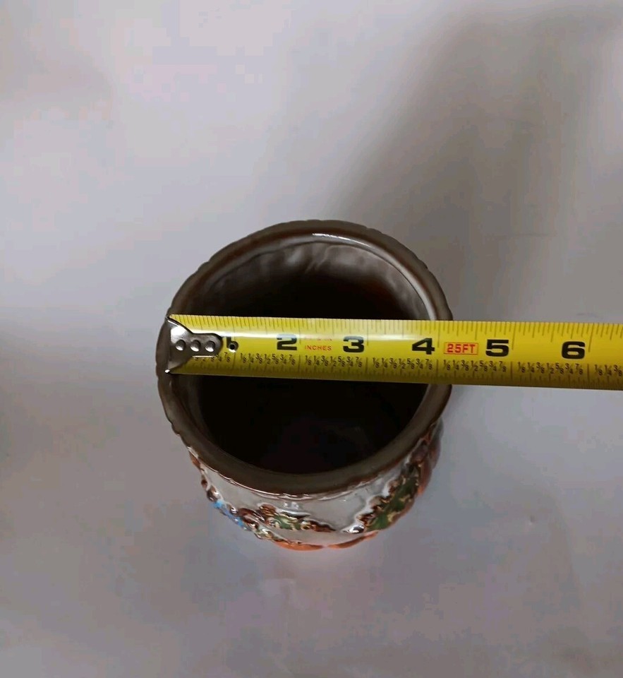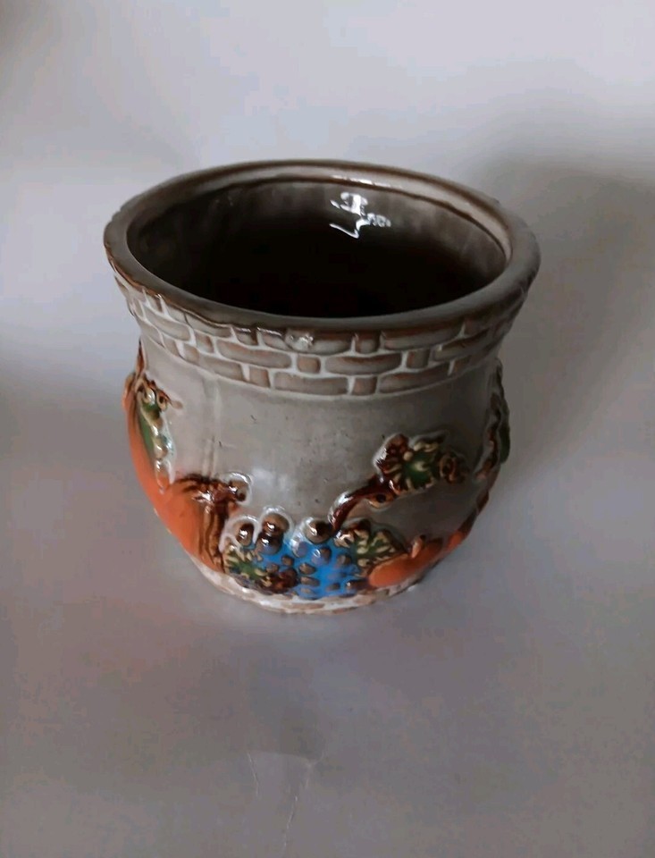 This vintage pottery planter features a detailed fall harvest pattern with a multicolor design, making it a unique and charming addition to your decor. Crafted from clay with a glazed finish, this mid-century modern piece exudes a pumpkin-themed aesthetic perfect for the autumn season. The art pottery production style adds character and craftsmanship to this eye-catching piece.Normal wear.