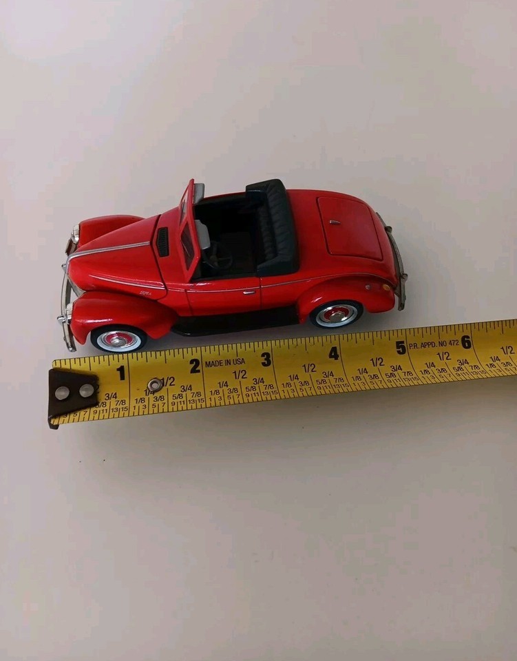 This 1940 Red Ford V-8 Roadster diecast model by Golden Wheel is a must-have for any car enthusiast. With approximately 5 inches in length, this red car features an opening hood and rumble seat, making it a perfect addition to any collection. The model is recommended for ages 15 and up. Add it to your collection today. Normal wear. See Pictures.