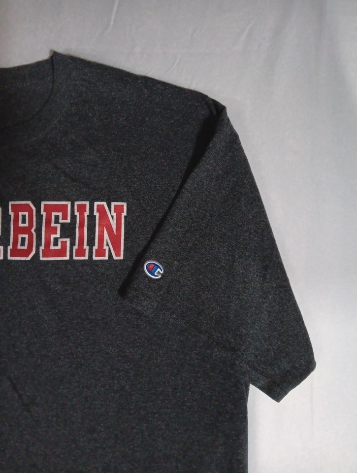 The Otterbein T-Shirt in Champion brand is a dark gray shirt with red lettering, featuring a graphic print of Otterbein a College in Ohio With a crew neckline and short sleeves, this 2XL shirt is made of a blend of polyester and cotton, making it comfortable for all seasons. The regular fit and easy-care material make it a great addition to any wardrobe, representing their college in style. Normal wear.