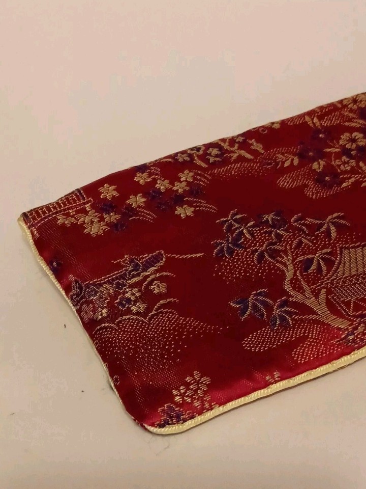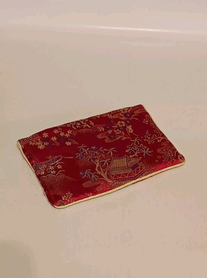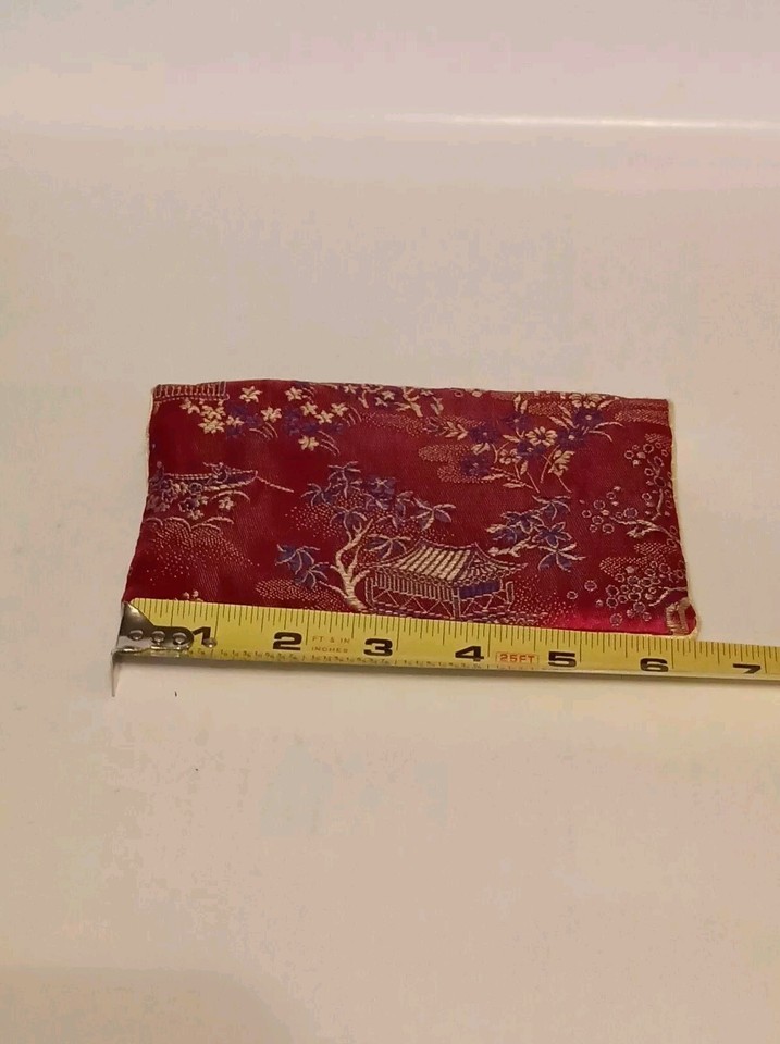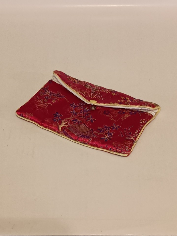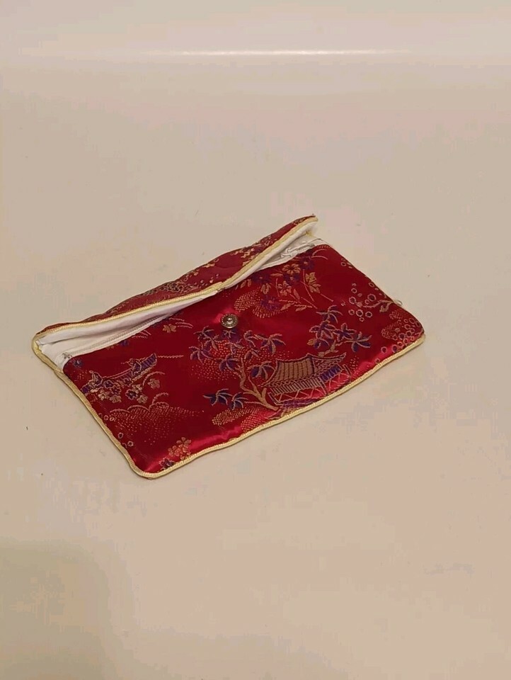 This small, red coin pouch wallet is a unique addition to any collection. With a retro style and oriental pattern, it is perfect for those who appreciate vintage items. The wallet is made from a silk blend material and features a snap closure for secure storage. The wallet is designed for women and measures approximately 6"x4". It is perfect for storing coins or other small items. The envelope style is practical and the red color adds a pop of color to any outfit. The wallet is categorized under Clothing, Shoes Accessories, Women's Accessories, and Wallets. This is a vintage item with normal wear. See Pictures