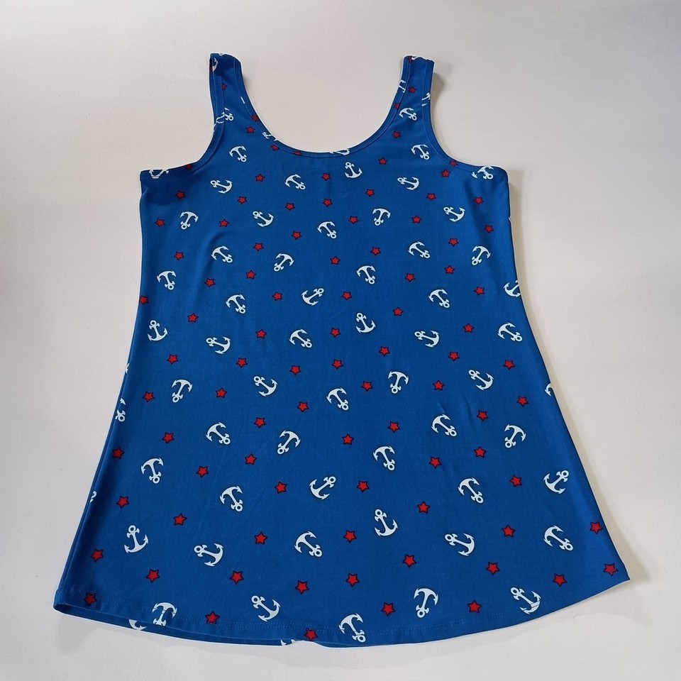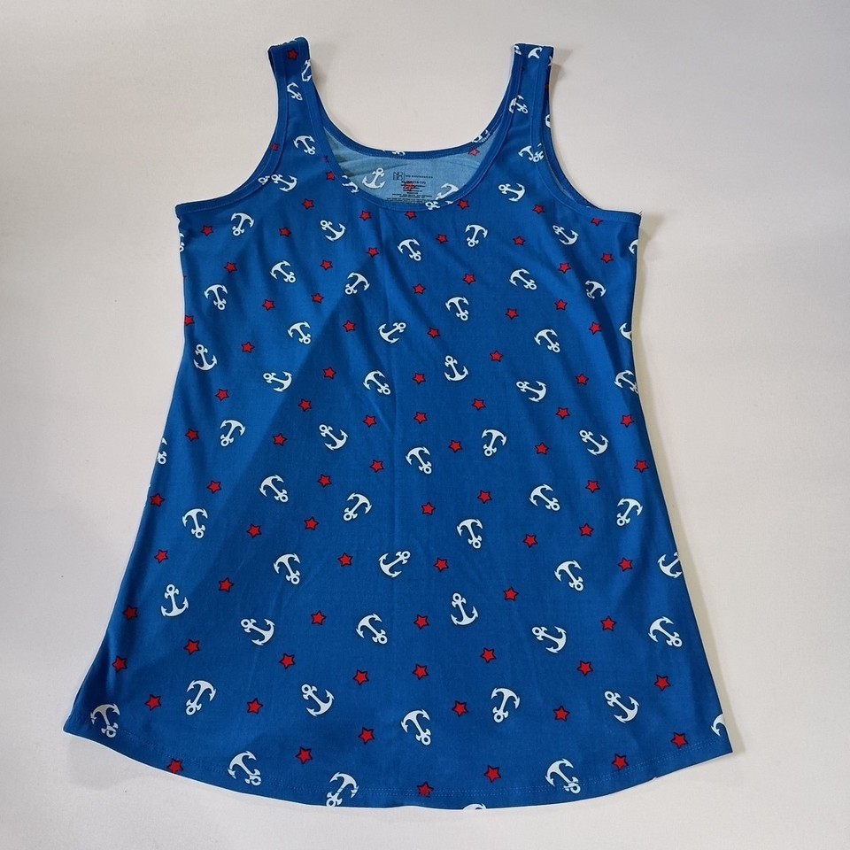 The No Boundaries Women's Tank Top in Blue with Anchors and Stars is a stylish and versatile addition to any woman's wardrobe. Made of a comfortable cotton spandex blend, this sleeveless top features a pullover closure and a regular fit. Perfect for casual occasions during the summer and spring seasons, this lightweight and stretchy tank is designed with a beachy theme in mind, making it ideal for a day at the beach or by the pool. The XL size offers a comfortable and flattering fit for women who wear sizes 15-17.Normal wear.