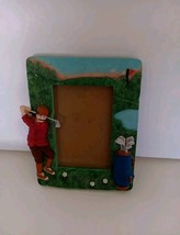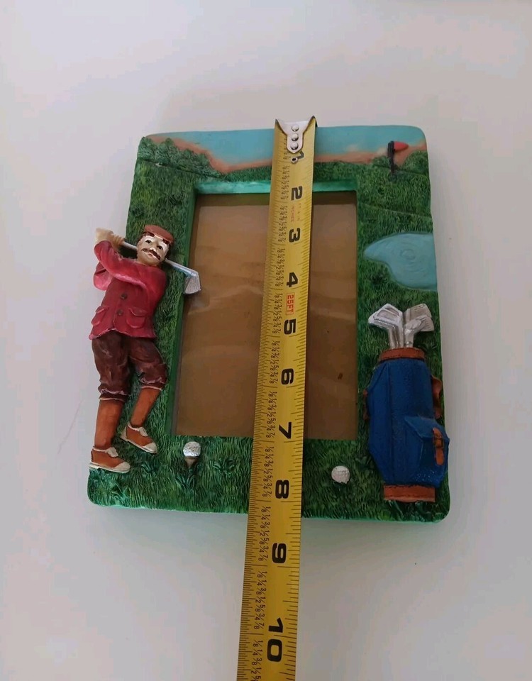 This Picture Frame features a golf theme with a 3D effect, perfect for any golfer or sports enthusiast. The frame is a rectangle shape with a green color and measures 6.5" x 8". Made of mixed materials and painted with a novelty style, it is suitable for all occasions and easy to install. The frame can hold one photo and is ideal for adults who enjoy golfing, making it a unique and eye-catching addition to any decor. Normal wear. Sizes are approximate.
