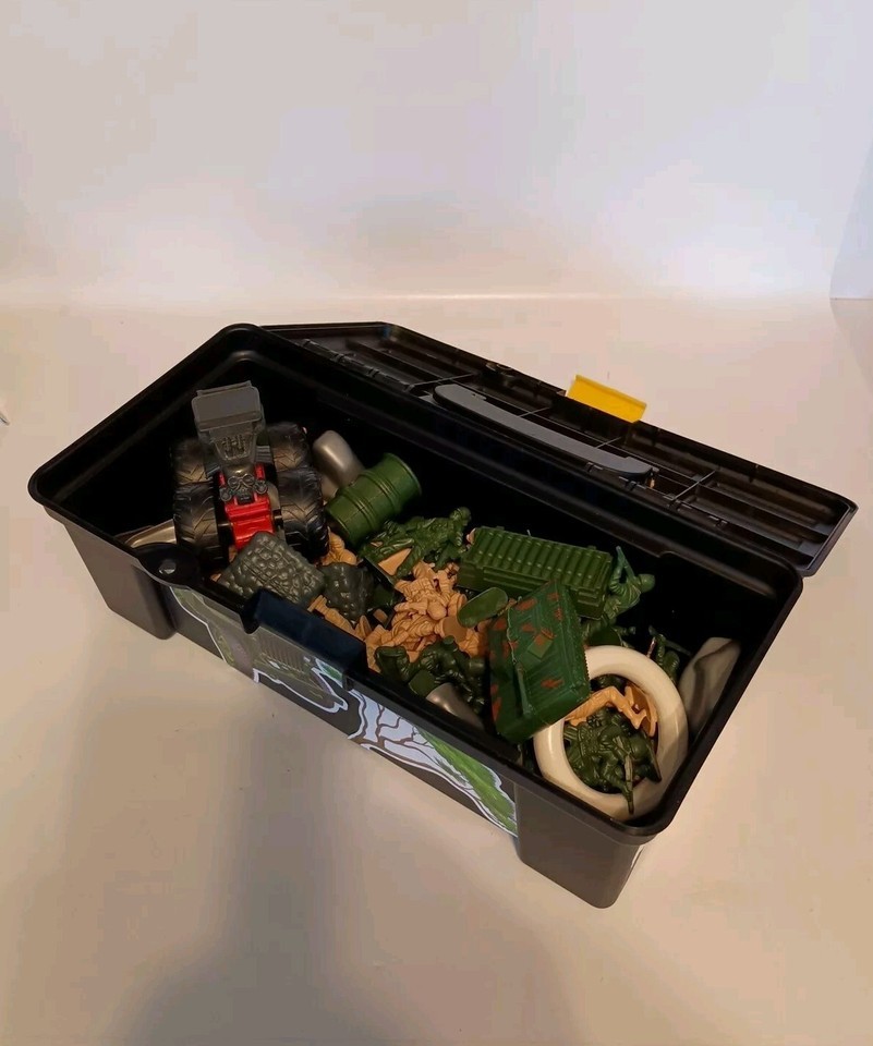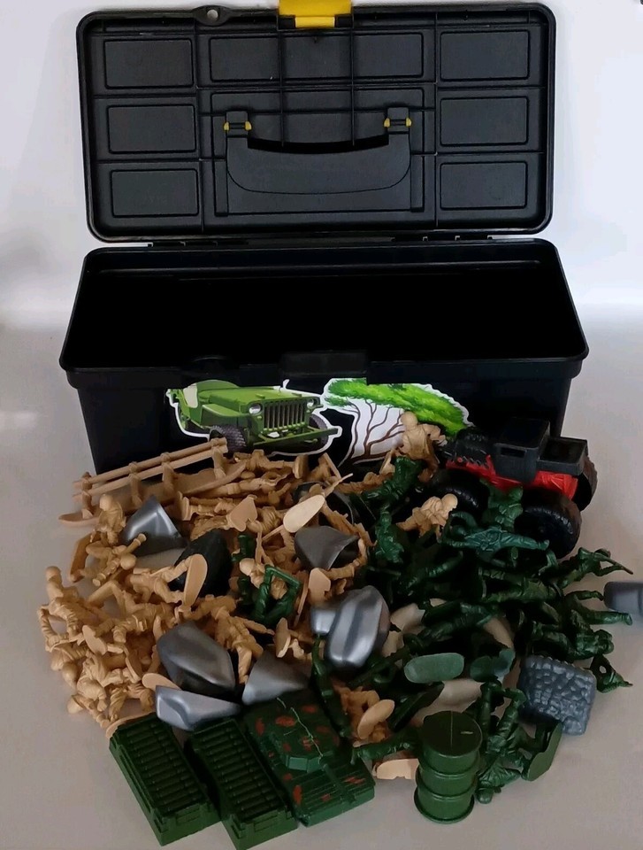 This mixed lot of 75+ pieces includes little figurines of army men, toy soldiers, and a carry case. The green and tan colored figures are made of plastic and belong to the Toy Soldiers franchise. The exact country or region of manufacture is unknown. Perfect for collectors or enthusiasts of action figures, this lot is a great addition to any collection. The variety of characters and items included, such as the carry case, make it a unique and interesting assortment. Don't miss out on the chance to own these little soldier figurines.Normal wear. See pictures.