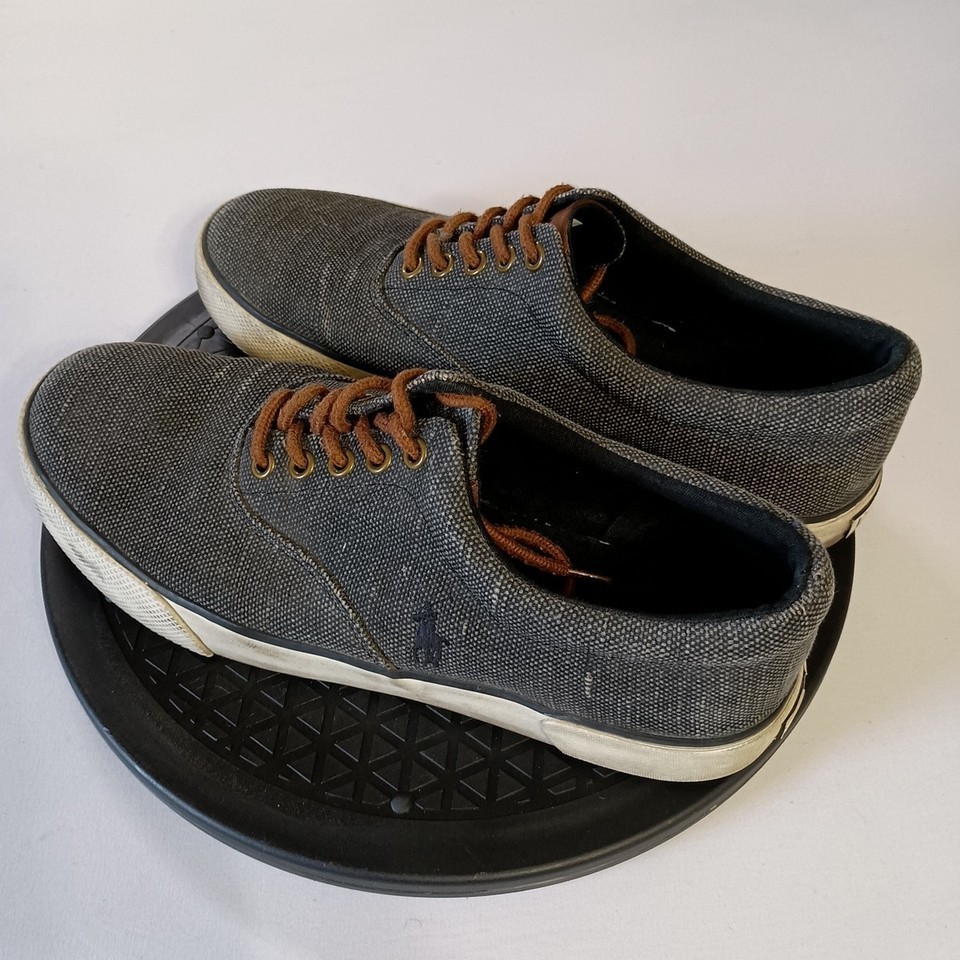 The Polo Ralph Lauren Forestmont II Shoes in men's size 9D are stylish canvas shoes featuring a 100% burlap upper in a sleek gray color. These lace-up shoes are perfect for various occasions such as travel, casual outings, and workwear. The shoes are designed with a logo accent and a synthetic outsole for durability. With a classic Polo Ralph Lauren brand, these shoes are a versatile addition to any wardrobe, suitable for all seasons. Normal wear.