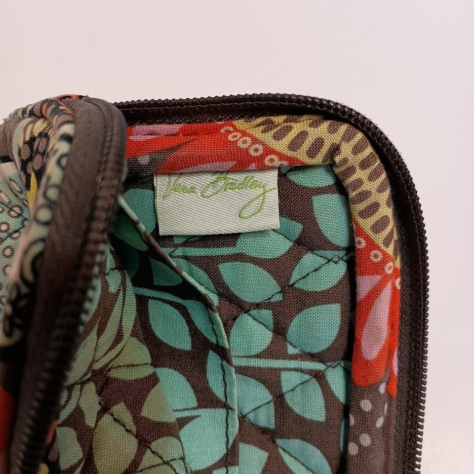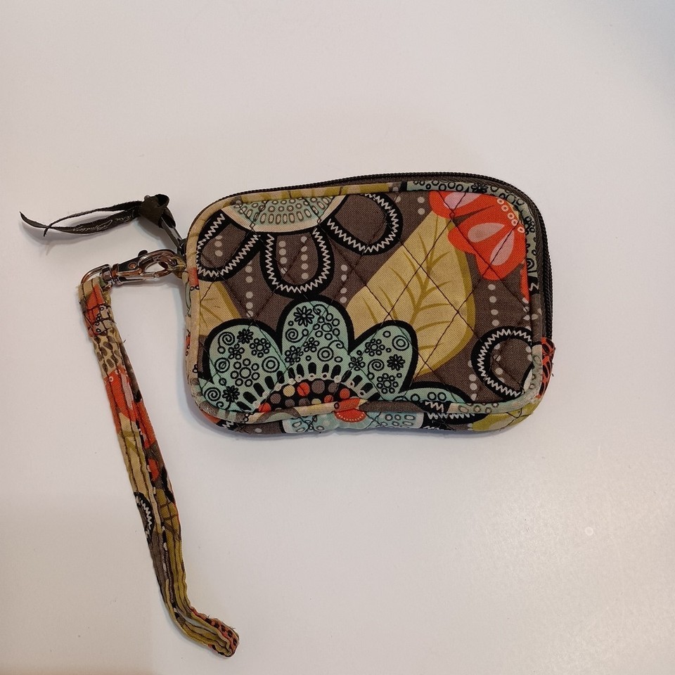 This Vera Bradley wristlet is the perfect addition to any boho-loving woman's accessory collection. With its vibrant, multicolored floral pattern and quilted cotton fabric, it exudes a funky, yet sophisticated charm. Measuring at approximately 5 inches in length and 3 1/2 inches in width, it's the perfect size for carrying your essentials on a night out or for everyday use. The wallet features a top zip closure and a detachable wristlet strap for hands-free convenience. Inside, you'll find an interior slip pocket to keep your items organized. The Vera Bradley logo ribbon zip pull adds a touch of elegance to this fun accessory. Normal wear.
