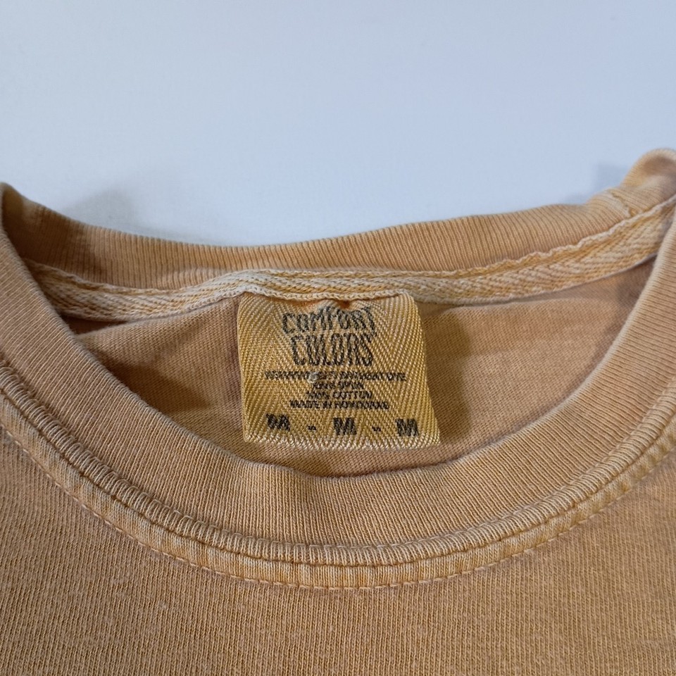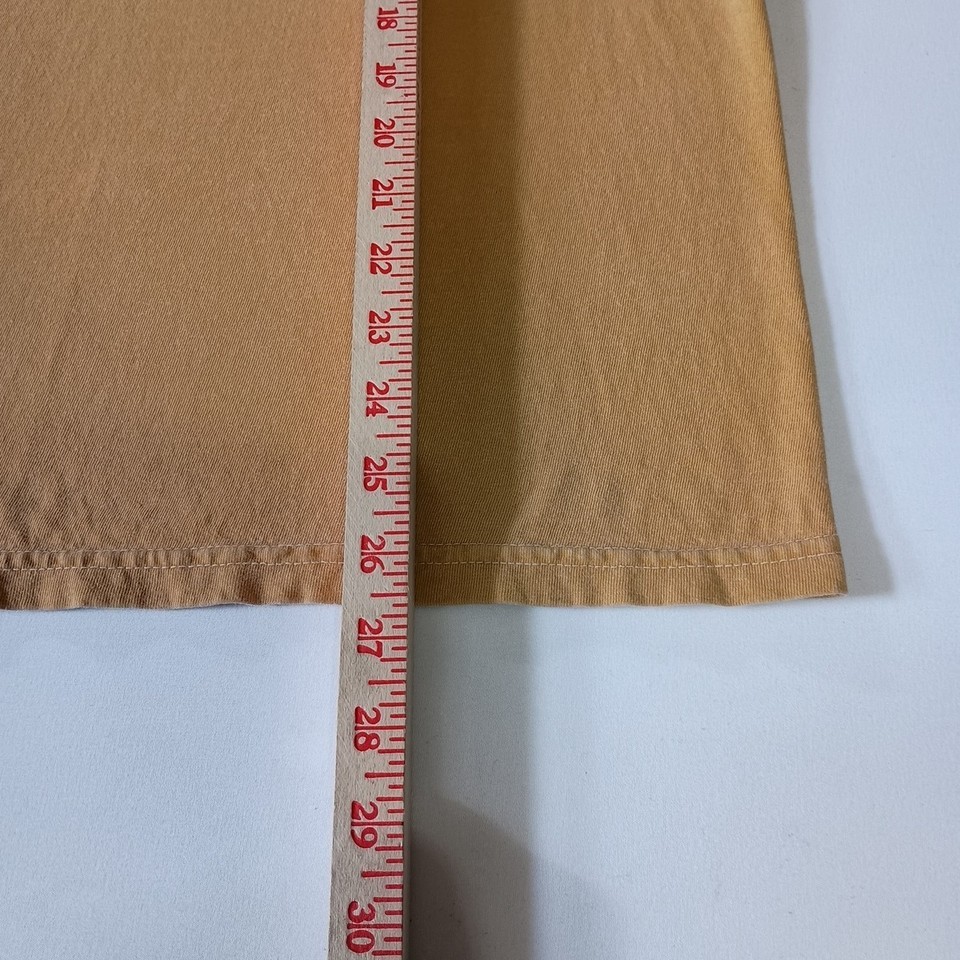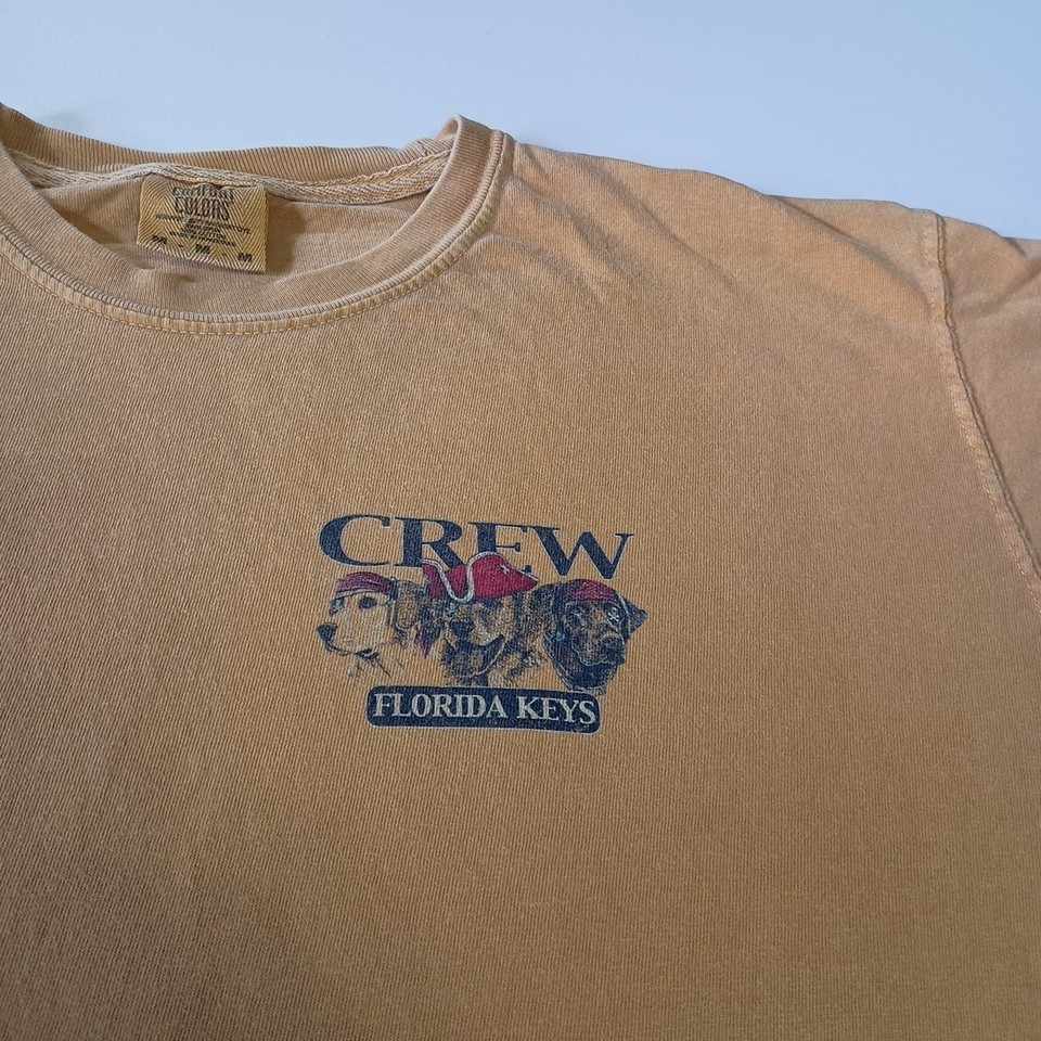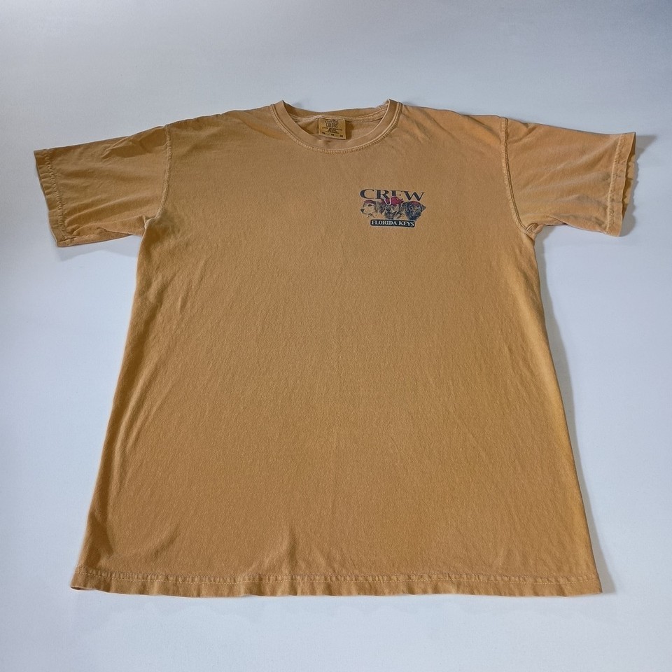 The CREW Florida Keys T-shirt in Men's/Adult Medium is a Butterscotch Yellow shirt featuring graphics on both the front and back. Made from comfortable cotton material, this short-sleeve tee has a classic Crew Neck design and a regular fit. The shirt is machine washable and perfect for wearing in the summer, fall, or spring seasons. With a fun Florida Keys Crew theme and a playful design, this T-shirt is a great choice for anyone looking to represent the Keys in style. Normal wear.