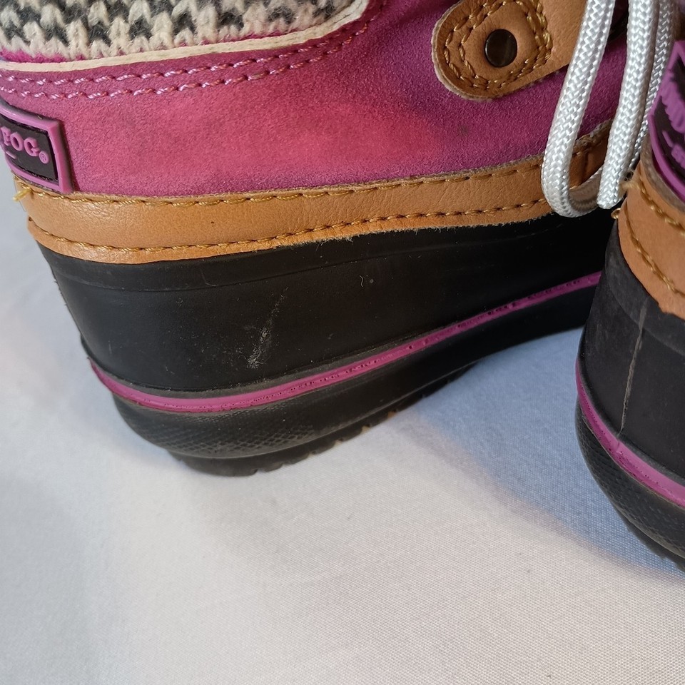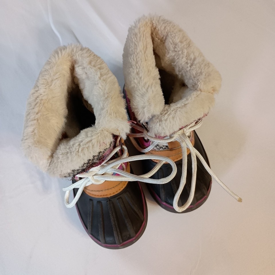 Keep your little one's feet warm and dry with these London Fog snow boots. These mid-calf boots feature a duck toe and are lined with faux fur. The lace-up closure ensures a secure fit, while the rubber outsole provides comfort and waterproofing. These boots are available in girls' size 8 and are a great choice for any occasion that calls for a sturdy, stylish snow boot. Normal wear. See Pictures.