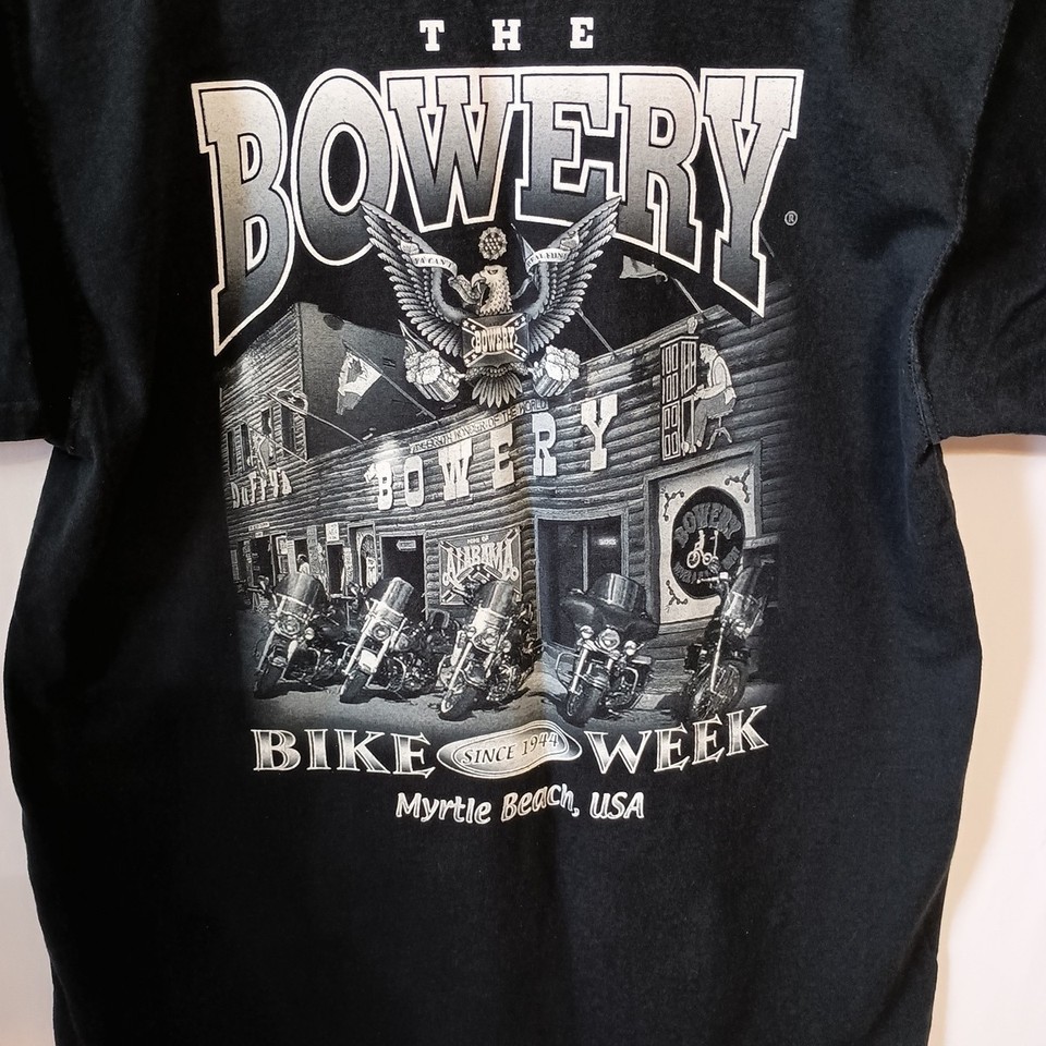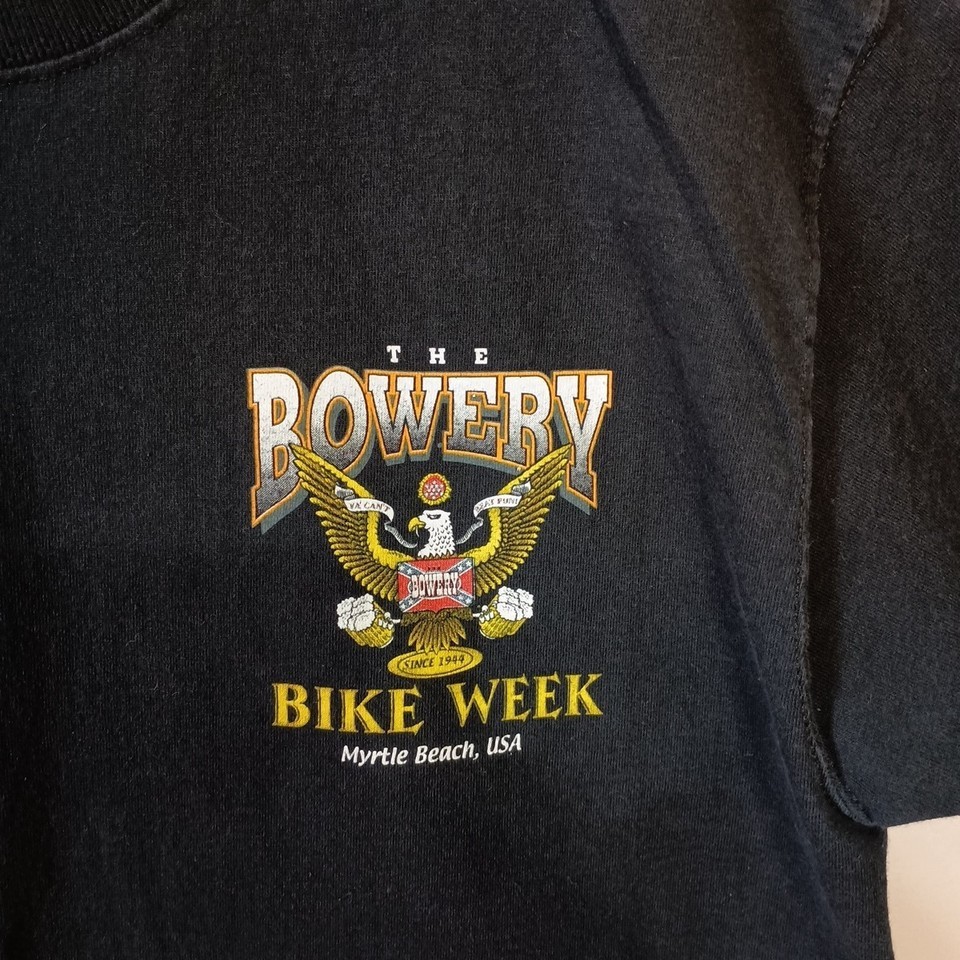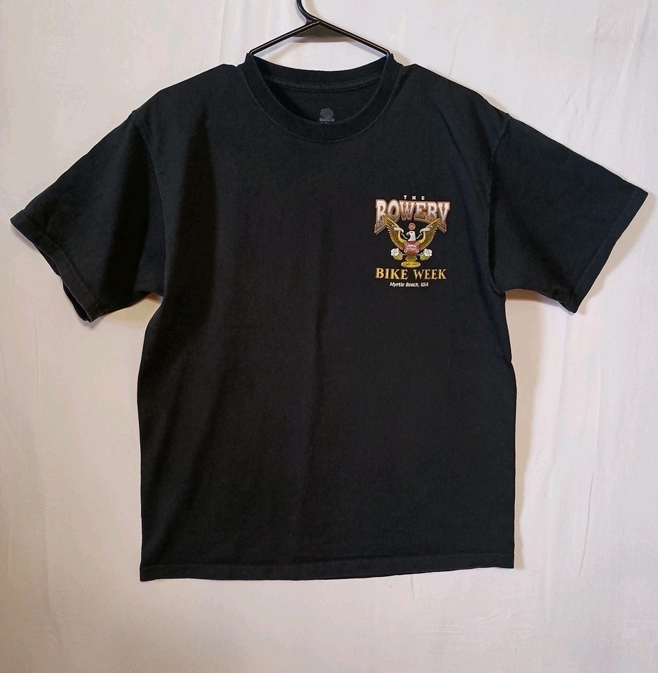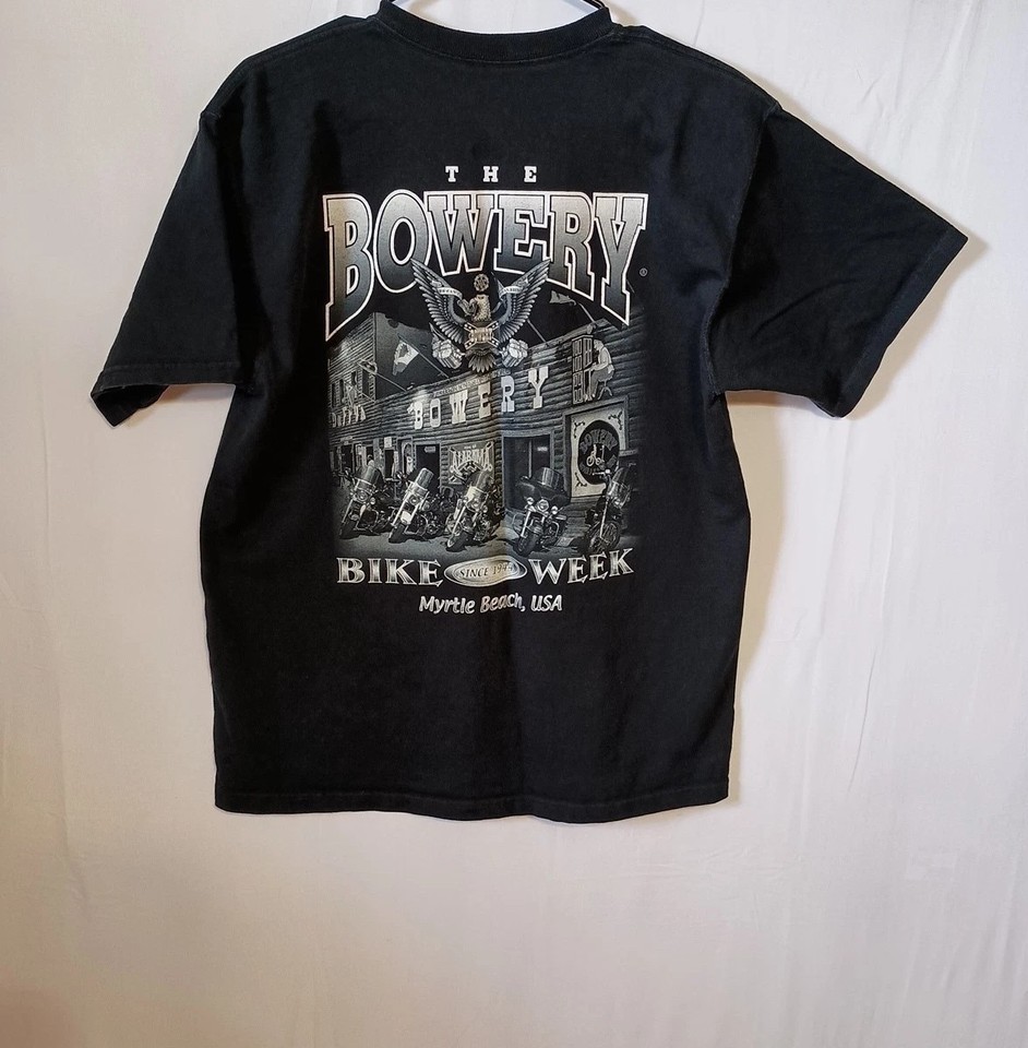 Show off your love for motorcycles with this black Fruit of the Loom T-shirt Size Large featuring Bowery Bike Week Meterl Beach USA. Crew neck and short sleeves. The shirt is made of comfortable knit cotton material that is machine washable for easy care. The double-sided graphic print showcases a motorcycle design, making it a great addition to any wardrobe for all seasons. This T-shirt is a must-have for any collection. Normal wear.