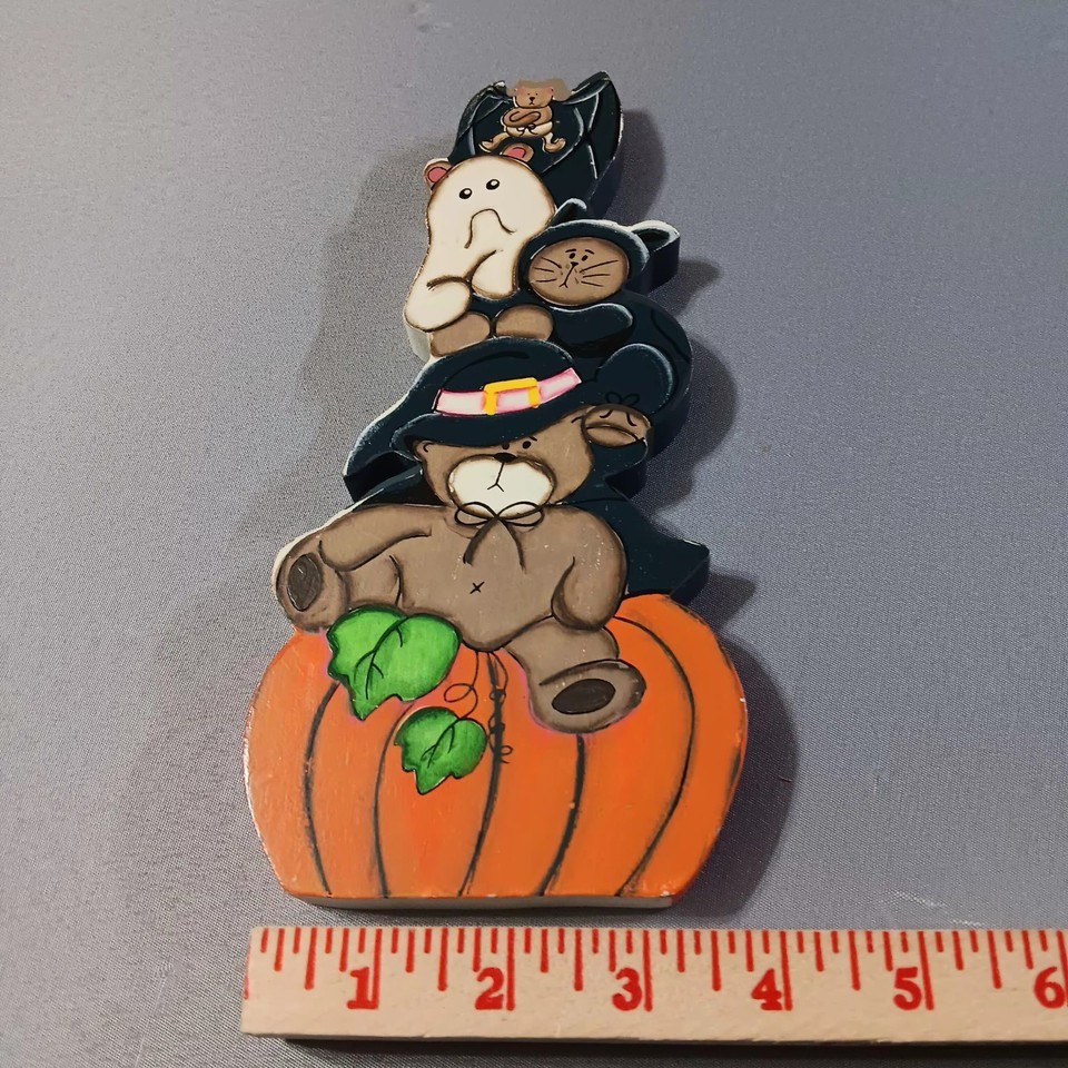 This Wooden Halloween Cutout Ghost Cat Bears Sitting On A Pumpkin is a small, multicolor figurine made of wood. The cutout design features a ghost, cat, and bears sitting on a pumpkin, perfect for adding a festive touch to your Halloween decor. Measuring 9 inches in height and 0.75 inches in width, this seasonal-themed collectible is a charming addition to any Halloween display. Good condition, normal wear. Size is approximate.