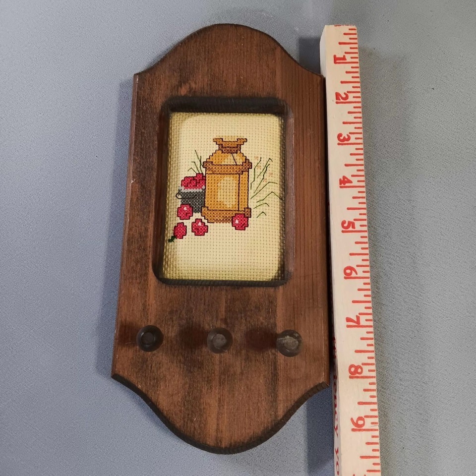 Vintage Wood Wall Hanging With Framed Cross Stitch and 3 Pegs Cute Decorative