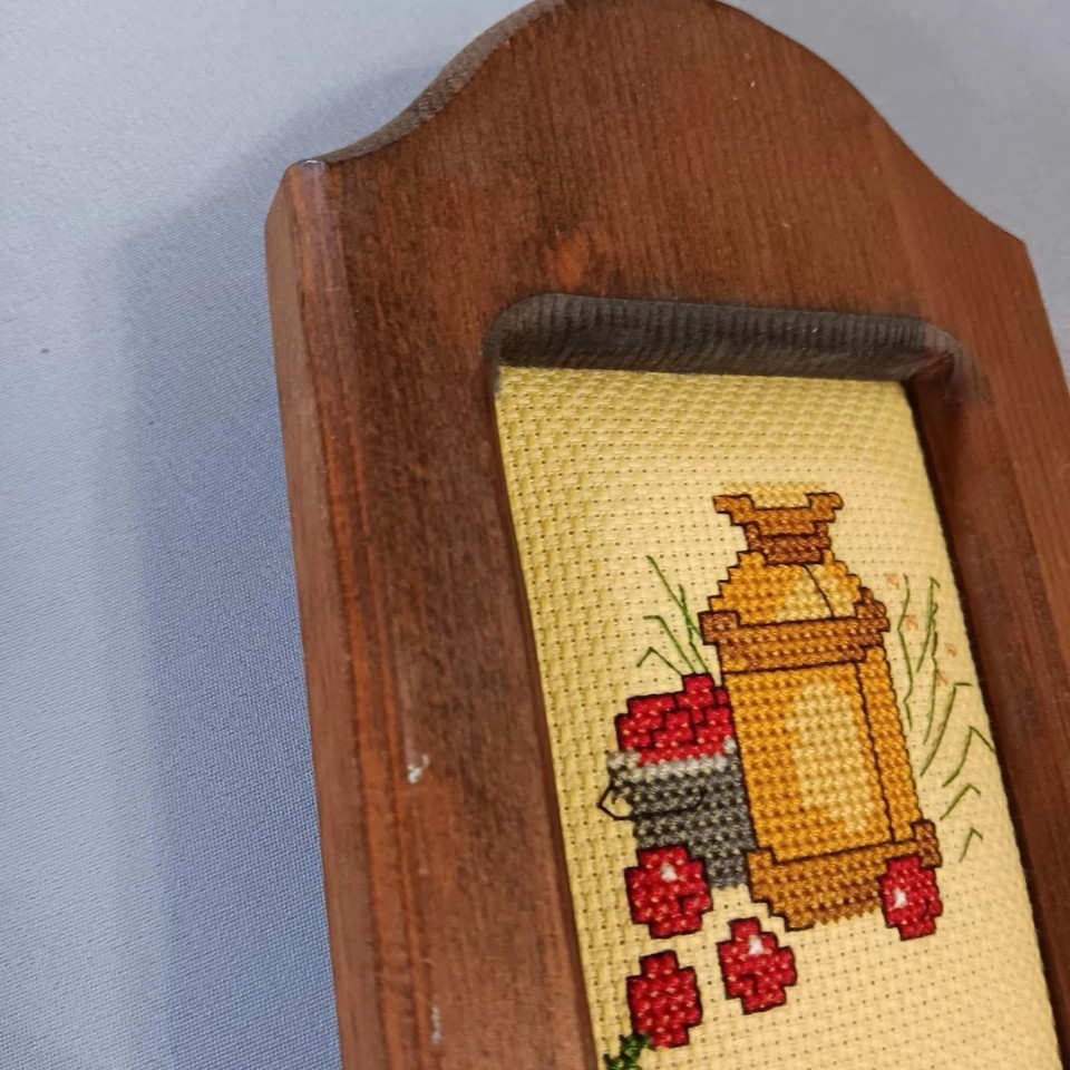 This vintage wood wall hanging features a framed cross stitch design with three pegs, making it a cute and decorative piece for your home. The rectangular shape and brown color give it a retro vibe, while the wooden material adds a touch of warmth to any space. Perfect for holding keys or displaying small items, this unique wall hanging will add charm to your home decor. Good condition, normal wear. See pictures, sizes are approximate.