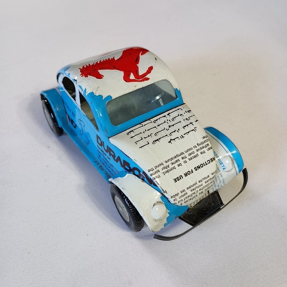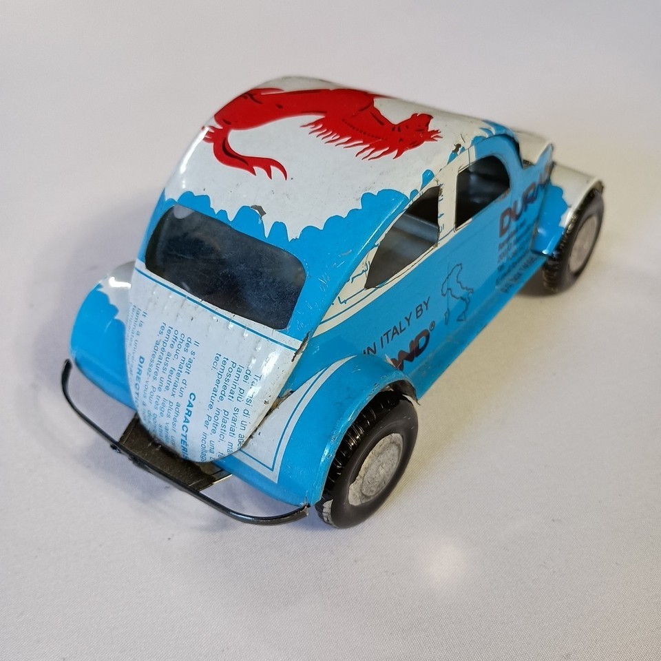 This product is a VW Bug tin car toy crafted from scrap tin metal in blue and white with a red stallion design. It is a unique and charming toy vehicle that captures the essence of classic Volkswagen design. The combination of colors and the character family of the VW Bug make this tin car a desirable collectible for vintage toy enthusiasts and car aficionados alike. Normal wear. Sizes are approximate.