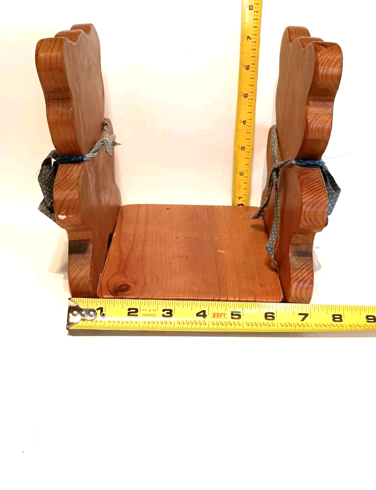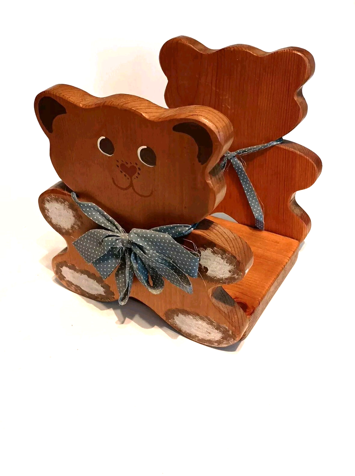 This product is a handcrafted wooden napkin holder in the shape of a bear. It is approximately 7 inches tall and 7 inches wide, and is designed in a country style with a handmade pattern. The napkin holder is made of wool and is brown in color. It is suitable for all occasions and is intended for adult use. The brand is handcrafted. Normal wear. See Pictures