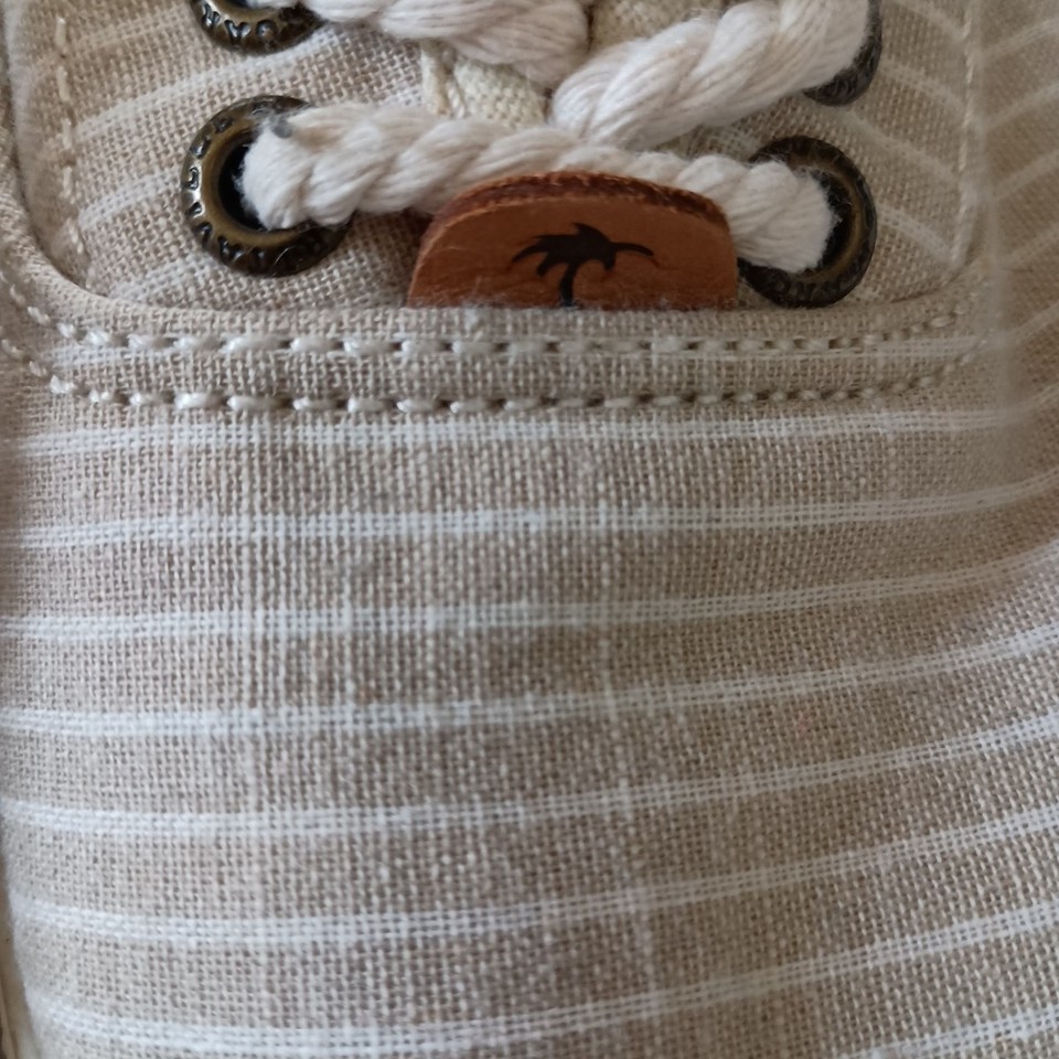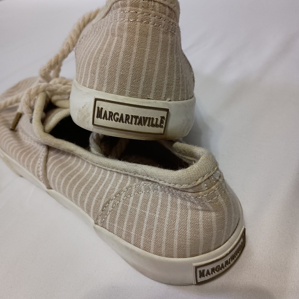 This product is a pair of Women's Margaritaville shoes in size 8.5, featuring a light beige color with white stripes. The shoes have a lace-up closure and a stylish palm tree theme, perfect for a casual and comfortable boat shoe look. Made with fabric material, these shoes are designed for women who appreciate both fashion and comfort. Normal wear.