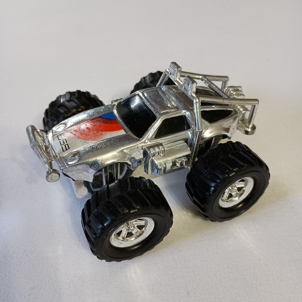 The Vintage Pull Back Powered Monster Truck Racer Toy is a collectible item that features a chrome plastic monster truck design. This pull back toy vehicle is part of a series of monster truck-themed cars and is perfect for young car enthusiasts who enjoy playing with toy vehicles. Made in China, this toy provides hours of entertainment for kids who love imaginative play and racing competitions. Normal wear. Sizes are approximate