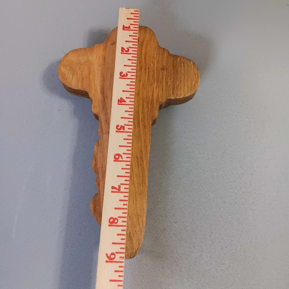 This vintage key-shaped key wall hanger key holder is a unique and stylish addition to any home. Handcrafted from wood with a traditional hook style, this brown key hook features 7 pegs for holding keys. The country farmhouse style and matte finish add a rustic touch to the decor. Easy to install and clean, this original piece is perfect for keeping your keys organized in style. Good condition, normal wear. Sizes are approximate.
