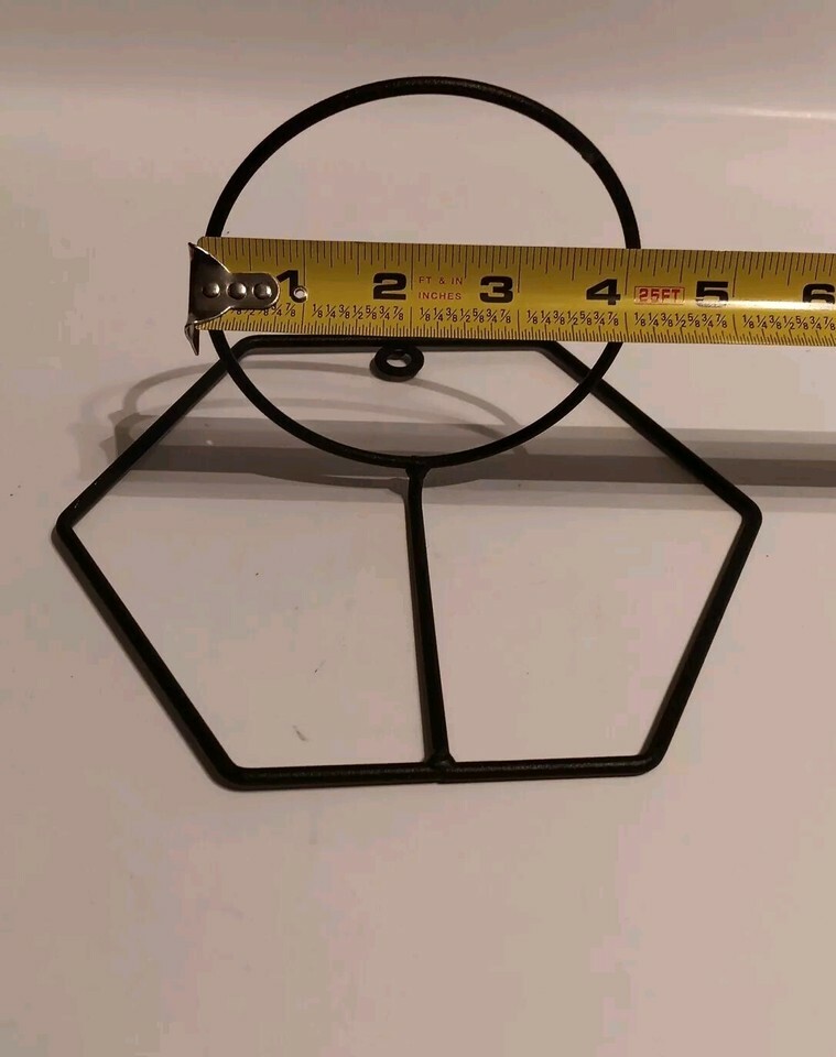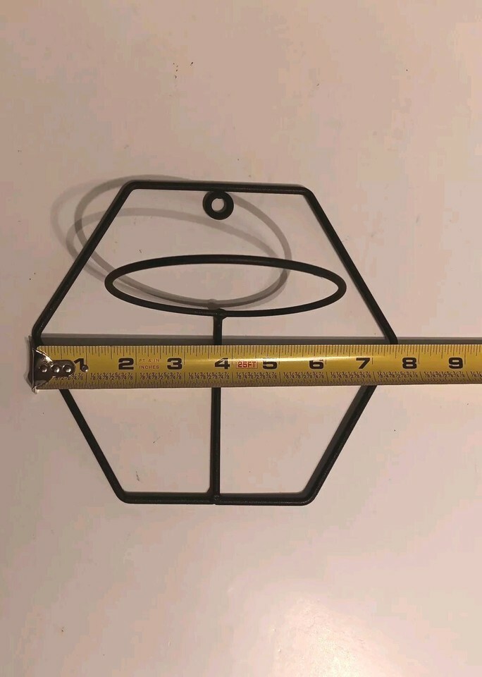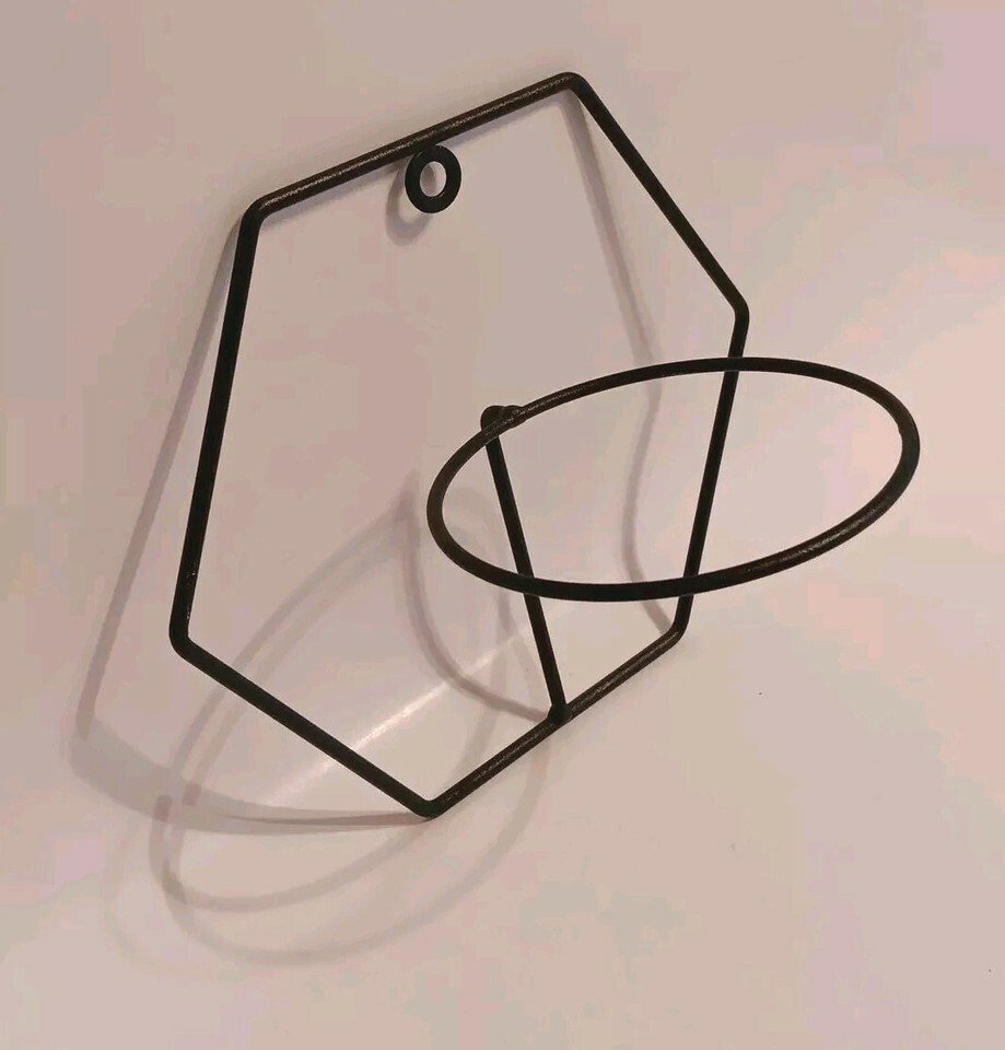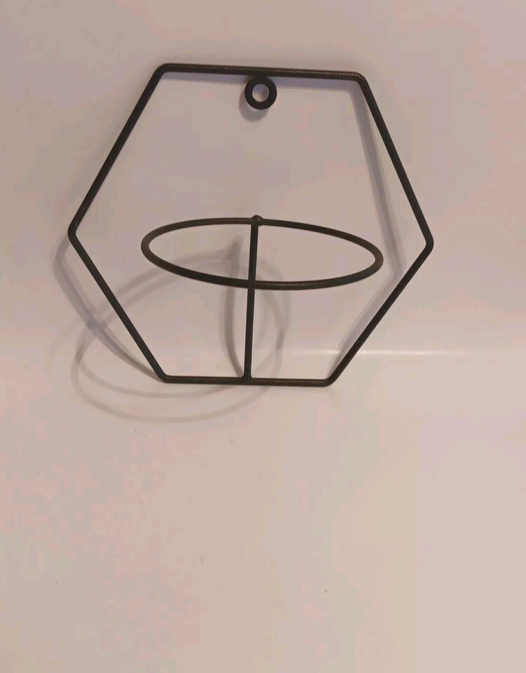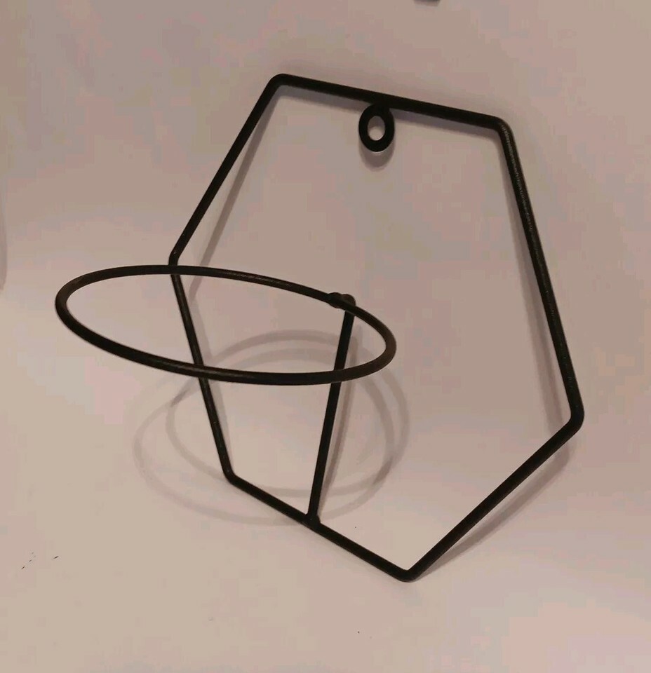 Add a touch of elegance to your home decor with this stylish hanging planter holder. The black wire hexagon shape holds a 4" flower pot, and the compact size allows for easy placement on any wall. The metal wire material ensures durability and longevity, while the unknown country/region of manufacture adds a unique touch to the design. This Wall Hang Flower Pot Holder is perfect for those who want to add a touch of nature to their home without sacrificing style.Normal wear. See pictures.