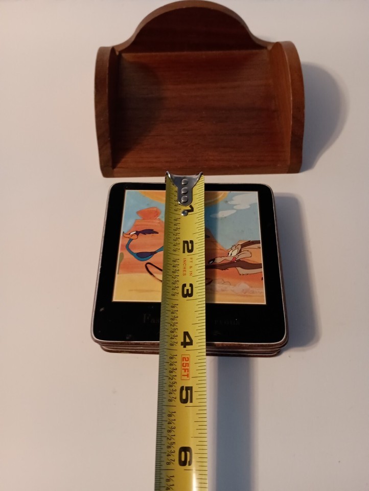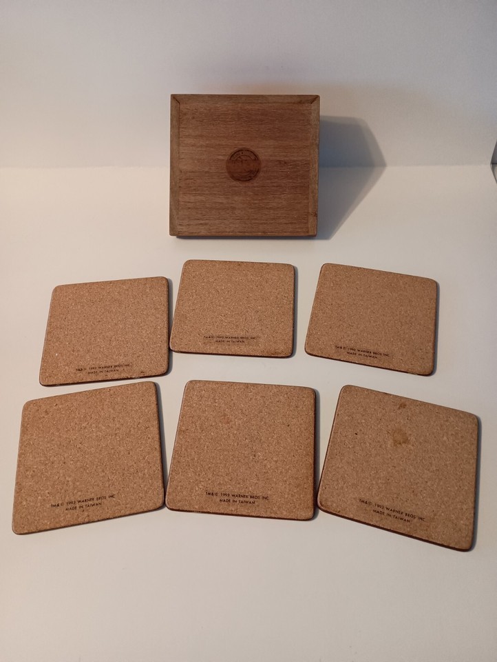 This vintage 1993 Looney Tunes drink coaster set features characters like Bugs Bunny and Road Runner, created by Warner Bros Animation. The coasters are made of mixed materials with a multicolor design, each measuring approximately 4" in length. The set includes a wooden holder for easy storage. This nostalgic piece from the popular Looney Tunes franchise is a collectible item perfect for fans of classic cartoon and TV characters. Made in Taiwan, these coasters bring a touch of whimsical charm to any space. Pre-owned, normal wear.
