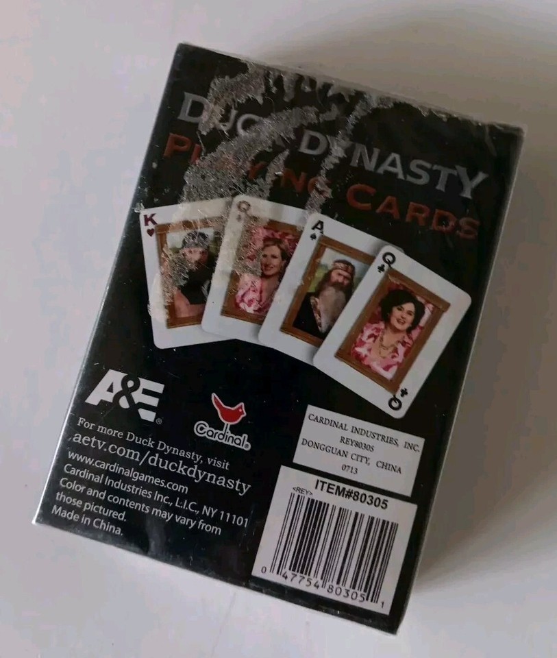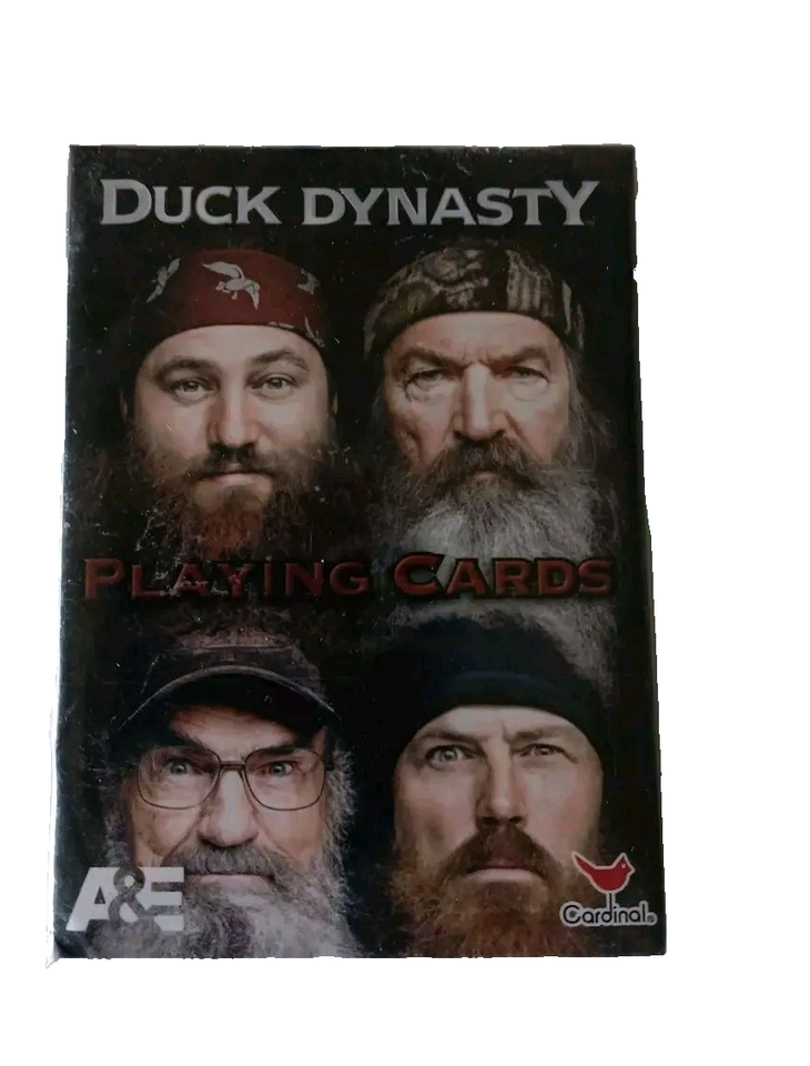 The Duck Dynasty Camo Hat/Cap and Playing Cards set features a fun and unique twist on the traditional deck of cards. The deck is sealed and new, making it a great addition to any collection or for fans of the show. The camo design and animal theme add a playful touch to the playing cards, making them a standout item for anyone who appreciates a bit of whimsy in their card games. Whether for casual play or display, this set is sure to provide hours of entertainment for duck enthusiasts of all ages. Normal wear. Cards are a sealed deck.