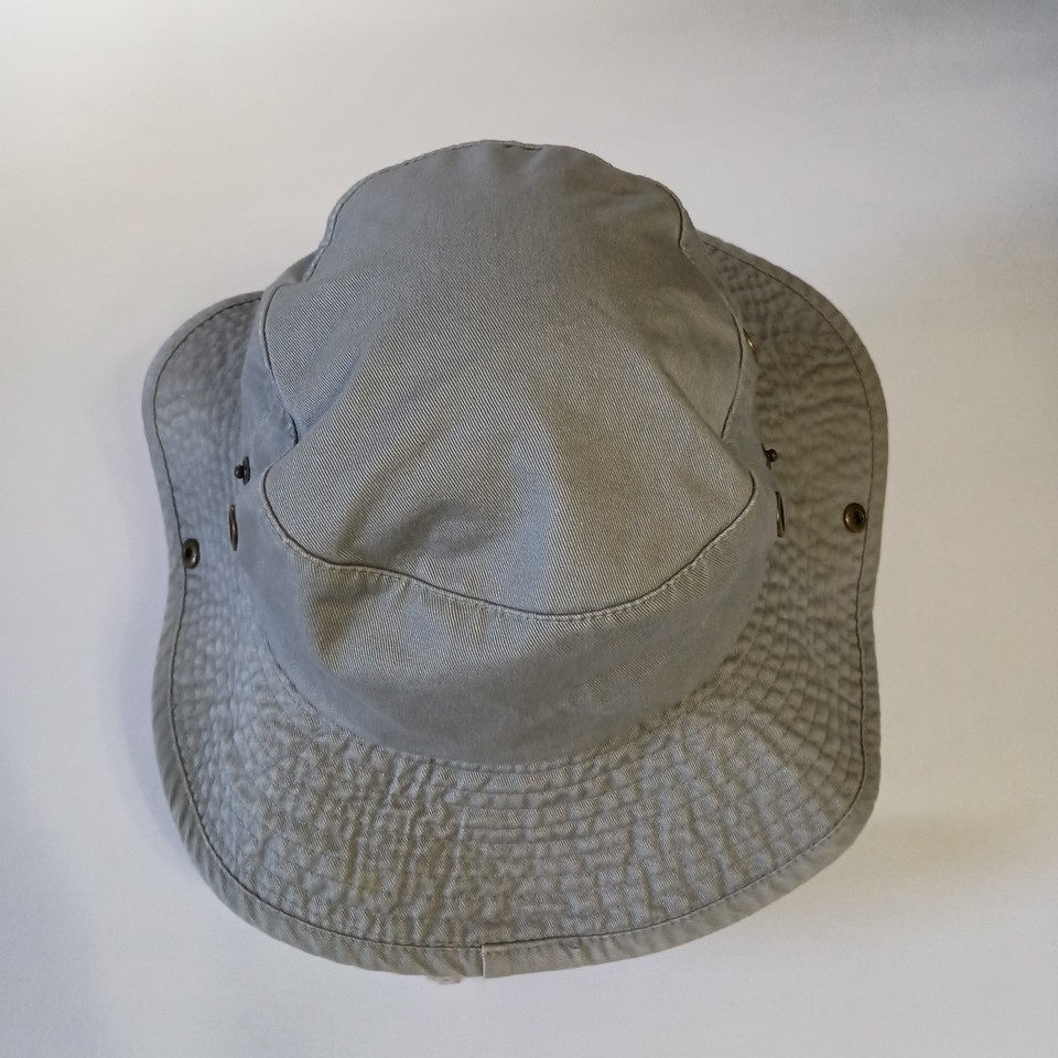 The ORMOND - BY - THE - SEA Bucket Hat in gray, size L/XL, by Newhattan is a stylish and versatile accessory perfect for casual occasions. Made from lightweight and breathable cotton, this adjustable bucket hat features solid gray color and classic style, making it a timeless piece for both men and women looking to add a touch of beach-inspired flair to their wardrobe.Good condition, normal wear.