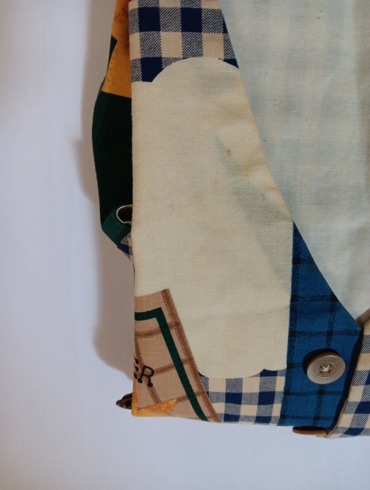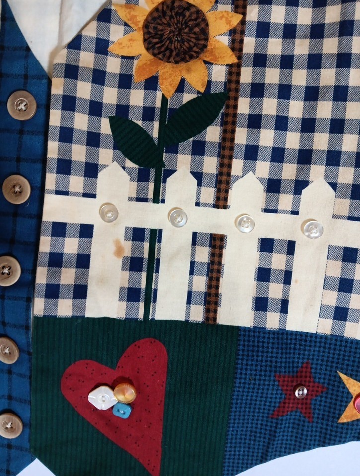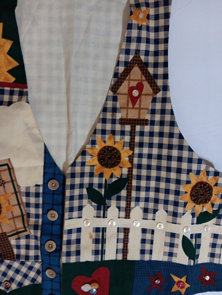 This vintage handcrafted sunflower vest is a colorful and unique addition to any woman's wardrobe. Made from cotton with a blue and white checkered design, it features bright yellow and red green accents that add a fun and eye-catching touch. The regular size M design is perfect for adding a pop of color to any outfit, making it a versatile and stylish piece for any fashion-forward individual. Normal wear. See pictures.