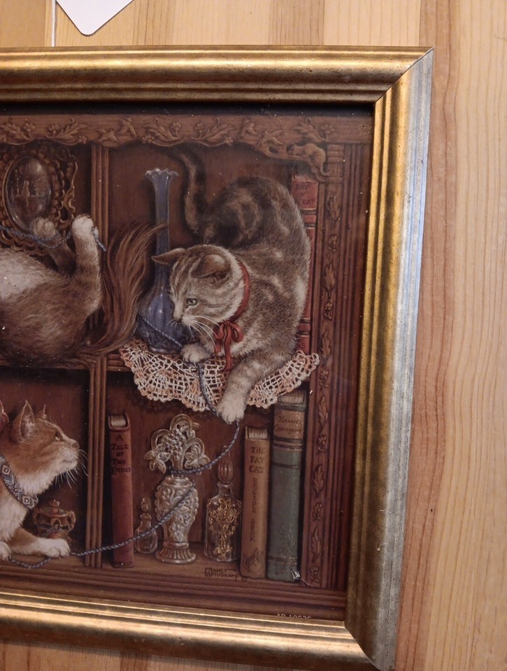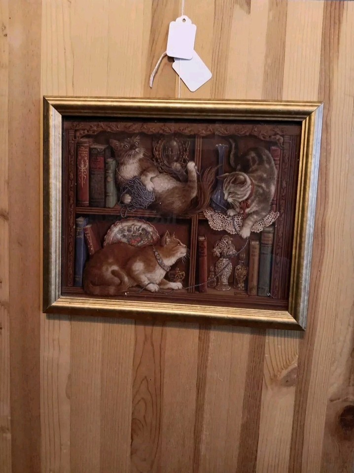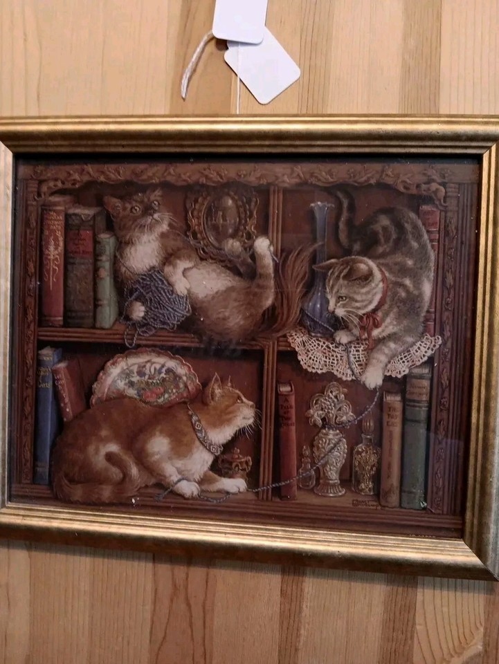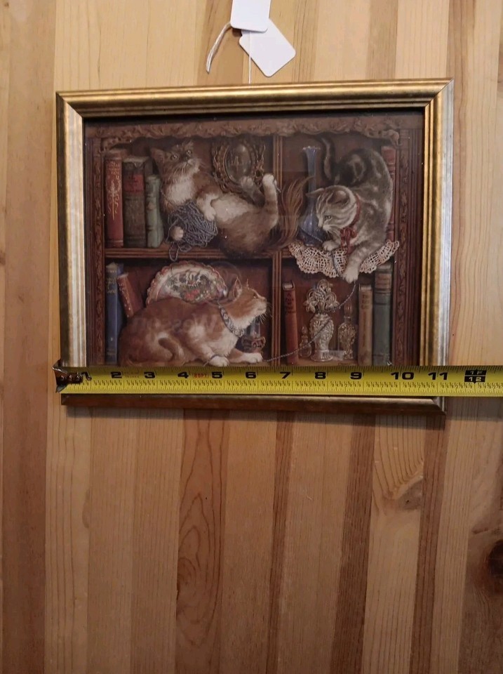 This beautiful framed print features adorable cats and kittens with a yarn art print in a gold frame. The print was produced in Canada in the year 2000 using screen printing techniques. The artist is unknown, but the piece is signed and numbered. Measuring approximately 11 inches in length and 9 inches in height, this small print is perfect for any cat lover's home. The modernist style and art theme make it a unique addition to any collection. This print is not personalized and does not have any features. It is a great choice for those who appreciate art and cats alike. This is a vintage item with normal wear. See Pictures
