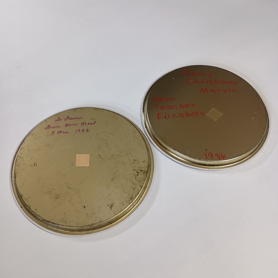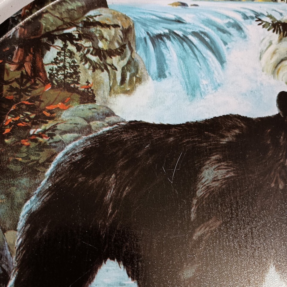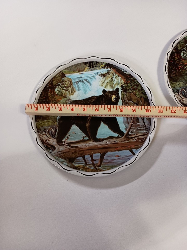 The product is a pair of vintage serving trays from the 1980s, featuring a black bear painted design on tin metal. Each tray has a diameter of 11 inches, making them perfect for serving drinks or snacks in a stylish and nostalgic way. The trays showcase an 1980s style and theme, adding a touch of retro charm to any home or collection. Made of durable metal and finished with painted accents, these trays are not only functional but also decorative pieces that evoke a sense of nostalgia for those who appreciate vintage aesthetics. Normal wear, scratches.