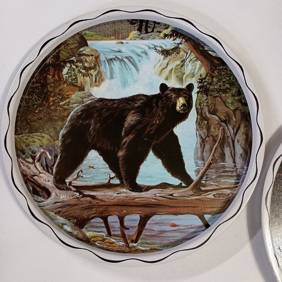 Vintage Serving Trays (2) 11” James Artig Black Bear Painted Tin Metal 1980's