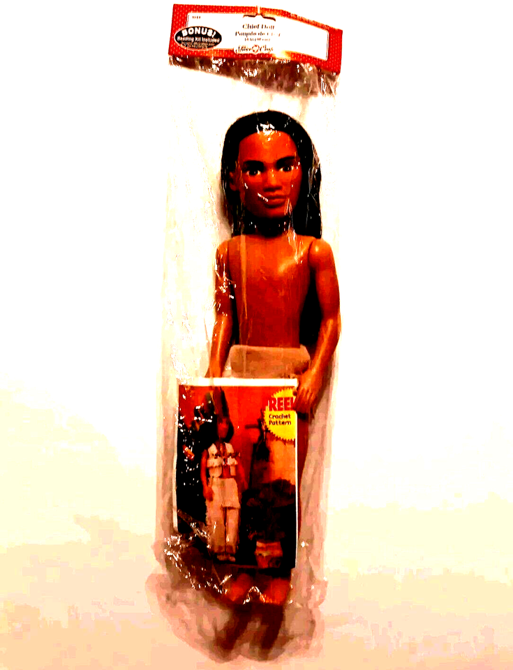 This vintage Fibre Craft doll kit includes all the necessary pieces to create a beautiful Native American Indian Chief doll. The kit features a 15-inch plastic figure with straight black hair and brown eyes, along with a beading kit for added detail. The doll's complexion is medium-light, and it is an original, licensed reproduction from 1995.