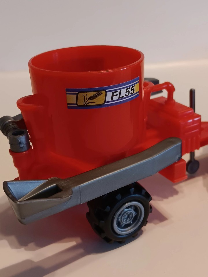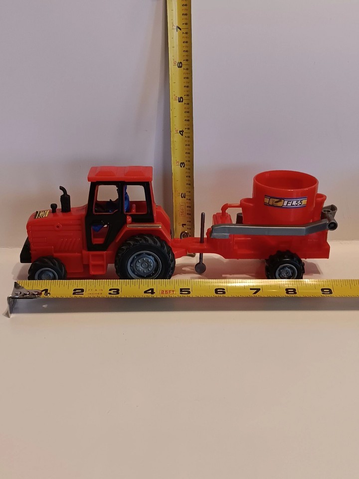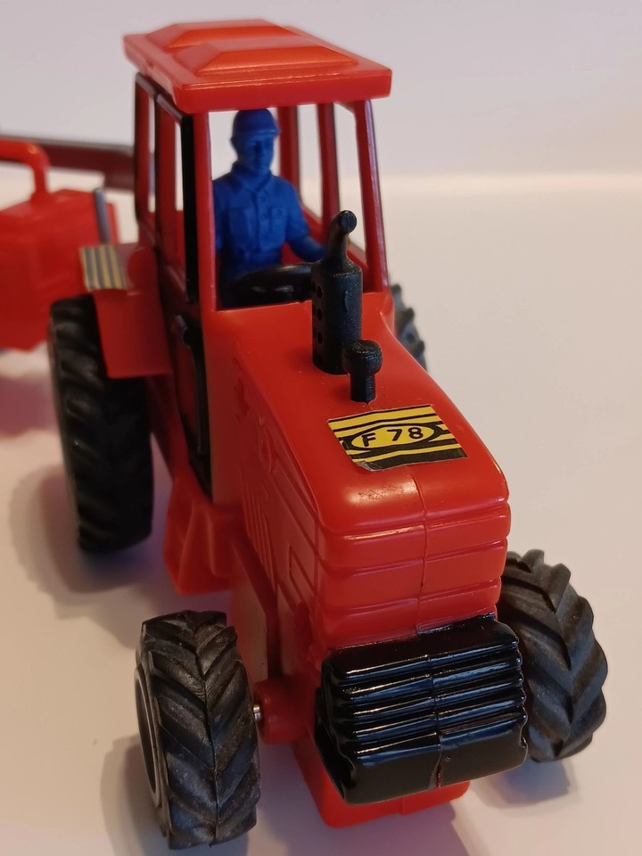 The Red Tractor F78 with Friction Motion #259 comes with a blue driver and is accompanied by the FL 55 Red Trailer #420. This tractor, measuring approximately 3 1/2" x 5", and approximately 10" overall length with the trailer attached is designed as a farming vehicle, featuring realistic details and a friction motion mechanism for added play value. Made of plastic and mixed materials, this toy is suitable for both boys and girls interested in farm vehicles. Manufactured in China, this set is part of the Farm Tractor character family, making it a fun addition to any toy collection. Normal wear.