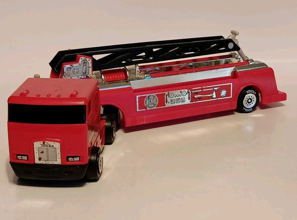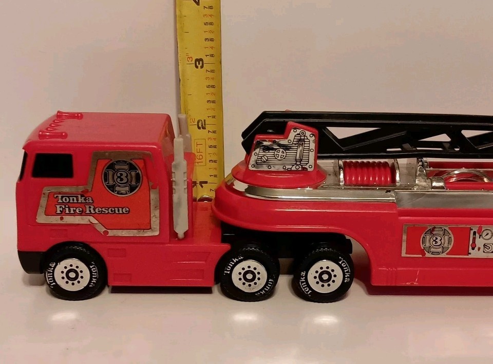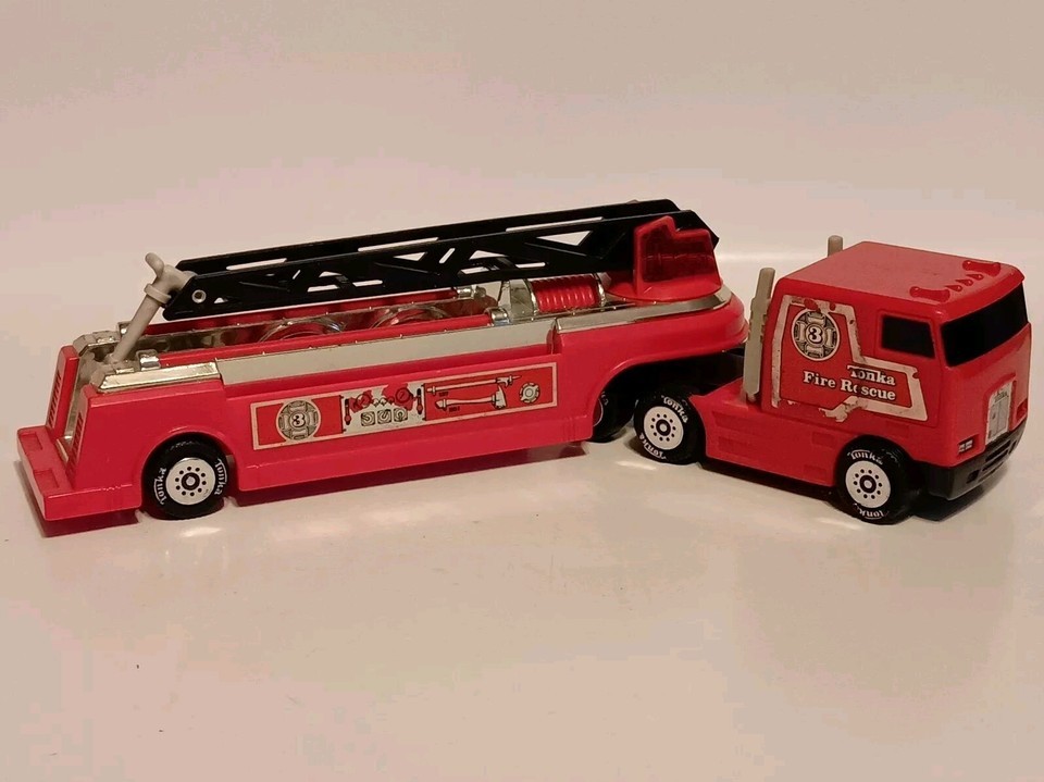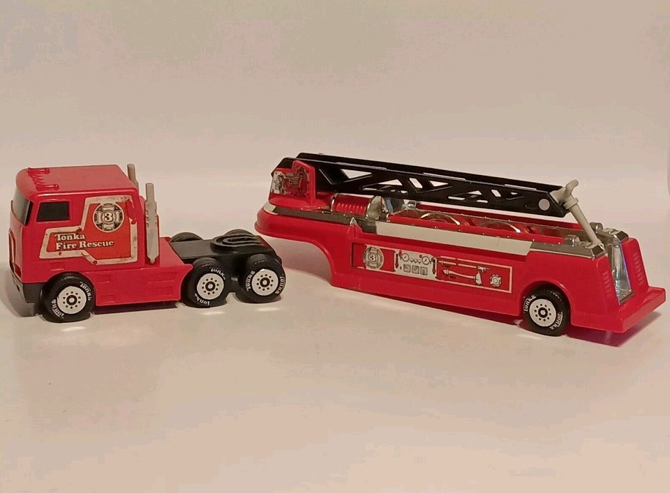 This vintage 1990 Tonka red Fire Rescue ladder truck includes two pieces made of red plastic. The model is part of the Tonka Fire Rescue series, featuring approximately 11" Fire Rescue truck. It is designed as a firetruck and is part of the "FIRE" character family. Made in China, this collectible toy is a part of the Toys Hobbies category. This is a pre-owned item with normal wear.