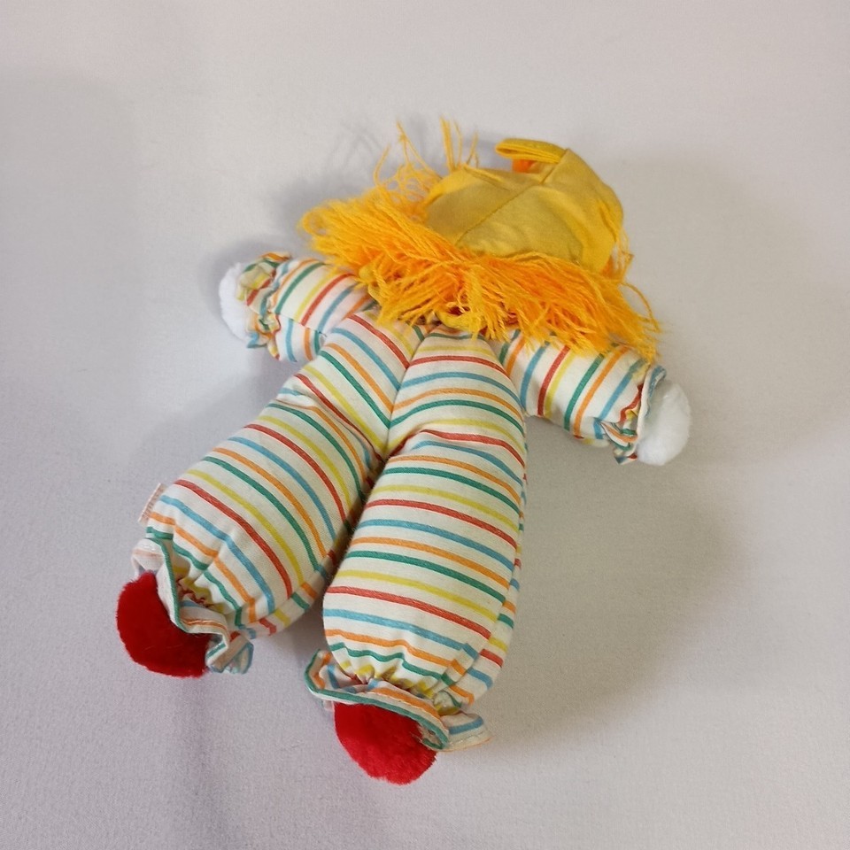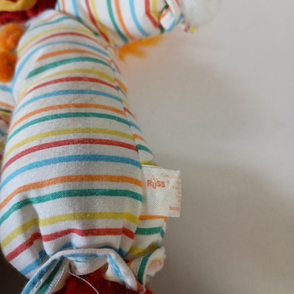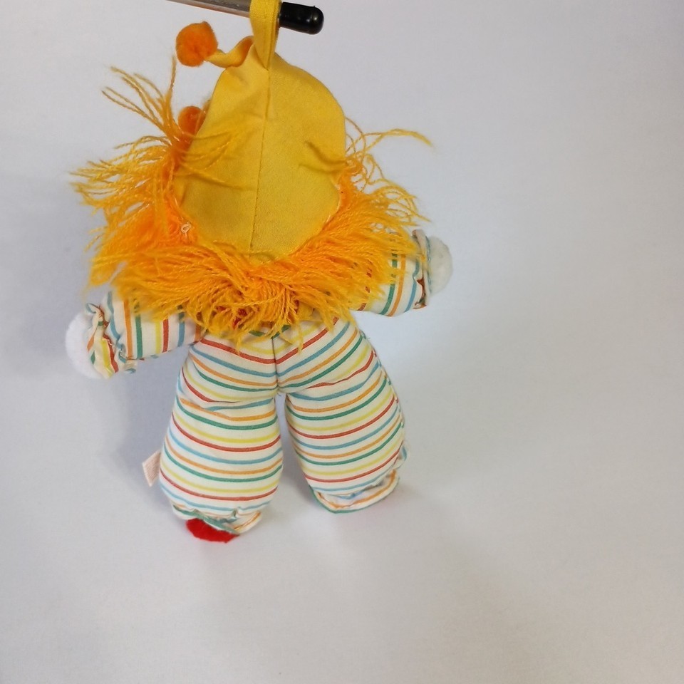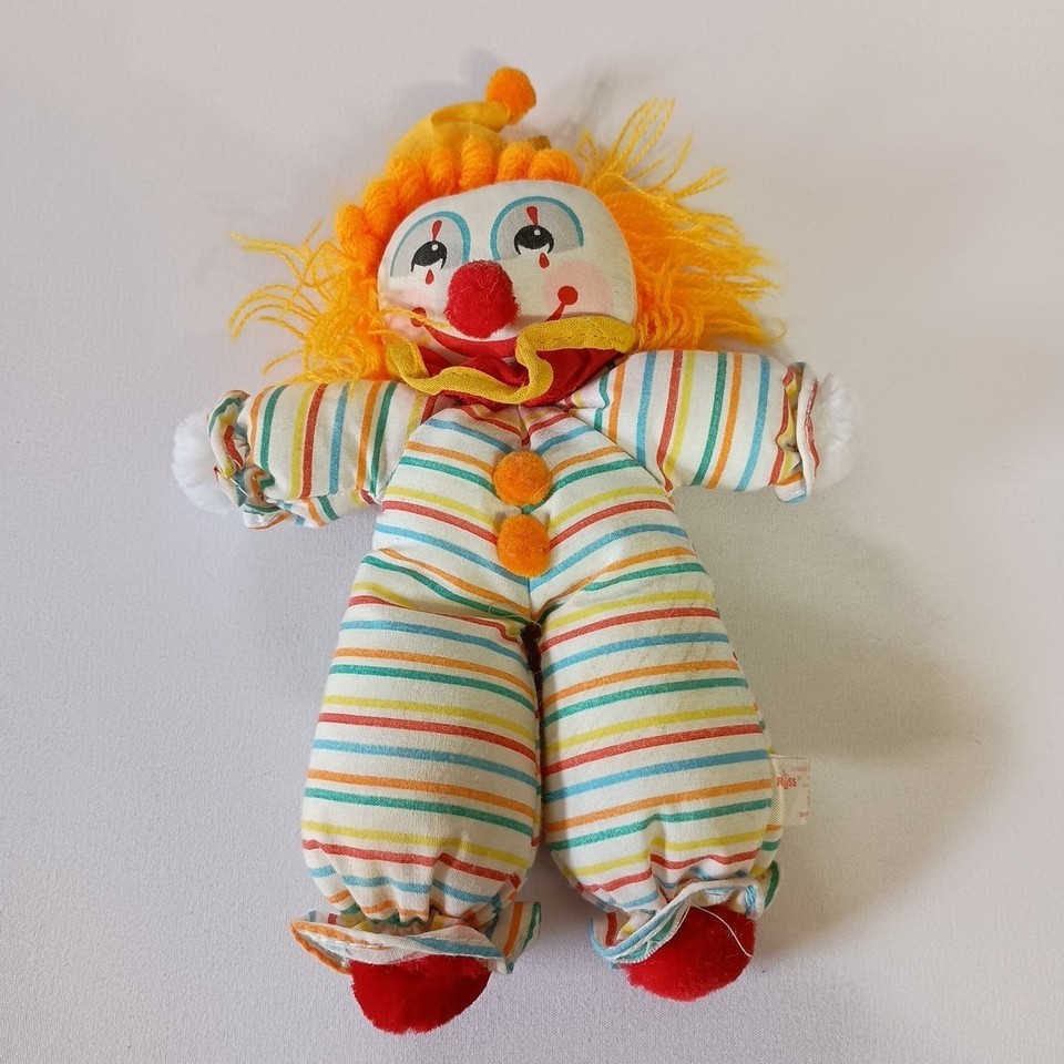 The Vintage Russ Stuffed Clown Doll is a charming addition to any circus or carnival-themed collection. This Yellow Orange haired clown doll from Russ is perfect for all occasions and comes as a single piece, making it ideal for adding a whimsical touch to any display or playset. Made of fabric, this clown doll is a nostalgic and fun item that captures the essence of a classic circus or carnival atmosphere. Normal wear. Sizes are approximate.