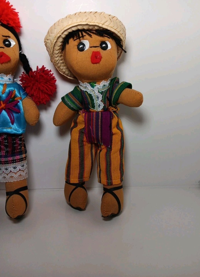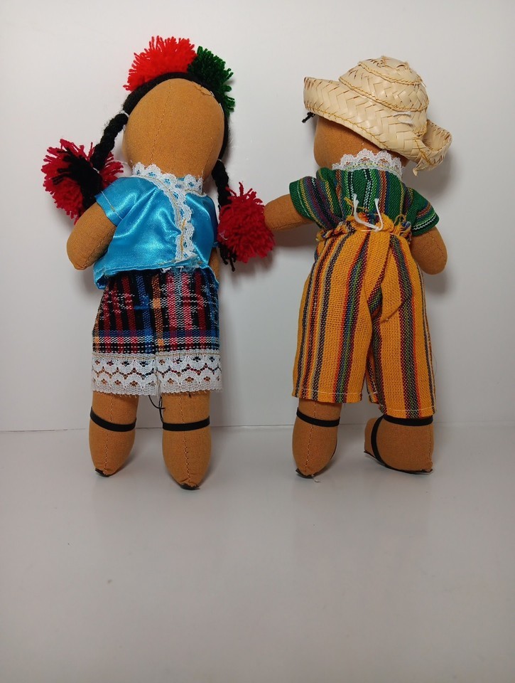 This product consists of two handmade cloth dolls, one boy and one girl, approximately 10" tall, featuring traditional Mexican folk art design. The dolls are crafted in Mexico and come with distinctive pigpompoms and Sumbaro, adding to their charm and authenticity. Perfect for collectors or those interested in Latin American cultures, these dolls showcase the rich tradition and craftsmanship of Mexican artistry. Good condition with normal wear and sizes are approximate.