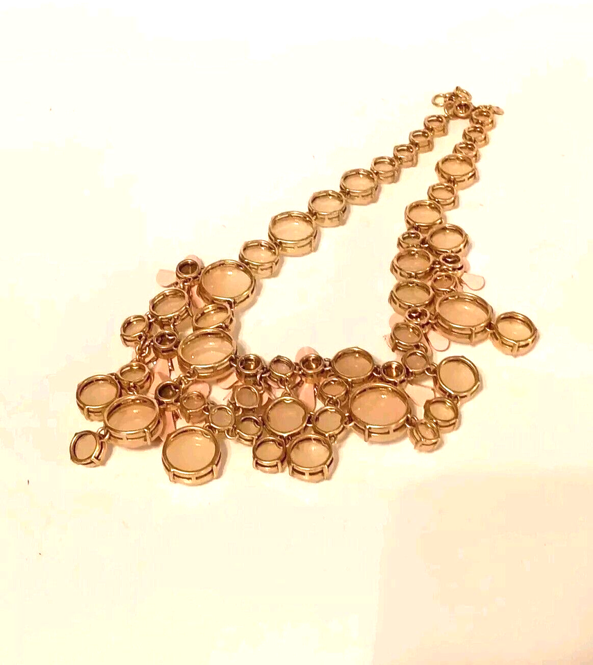 This J.CREW Jeweled Water Lily Necklace with beige stones boasts a statement cluster design with pink water lilies. The pendant shape is round, adding to its beauty and elegance. Featuring a spring ring closure, this necklace is perfect for any occasion, exuding a theme of beauty and sophistication. It is a stunning piece that will surely elevate any outfit with its intricate design and vibrant pink color.Normal wear.