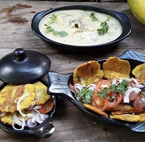 Product description: Deep oval family style serving platter in black clay from Region Tolima Colombia Length 11.5 inches (handles included), Width 8 inches (from outside), Height1.8. inches. Use for serving and also for roasting with the ease of handles for handling with a great presentation. Being oven proof makes them ideal for use under a broiler but is also perfect for a whole fried fish, enchiladas and stews. Completely natural and safe, contains no toxins or lead and the porous nature of the clay allows the slow evaporation of steam and produce food that is healthier, tastier, and moist using less fat and liquids. Will last many years with proper use and care (each piece comes with a product information sheet outlining the Uses and Care for the product). Black Clay, Cookware, is well-known and used throughout Colombia in restaurants and homes for preparing and serving traditional dishes. Its origins can be traced back at least 700 years to vases and pitchers found in pre-Columbian archaeological sites. It is still made in the traditional manner, by families in a small village on the banks of the Magdalena River in Central Colombia. Each piece is hand-made using local area clays, then hand burnished with a stone. The pieces are then fired in the village, giving them the distinctive black color and elegant look.