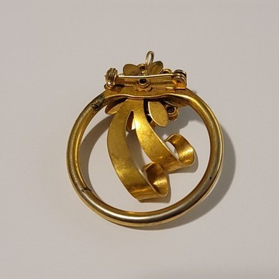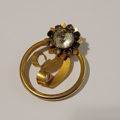 This charming vintage brooch features a gold tone circular design accented with a rhinestone flower at the top. The center stone is surrounded by smaller rhinestones, creating a delicate floral sparkle against the warm gold tone metal.