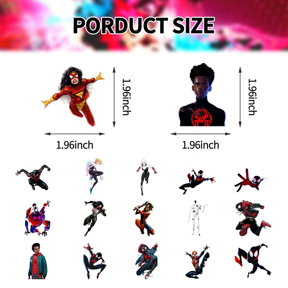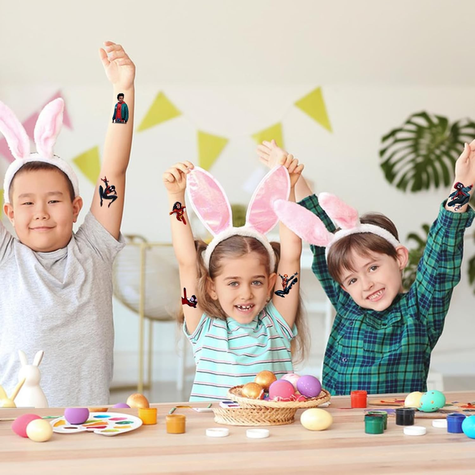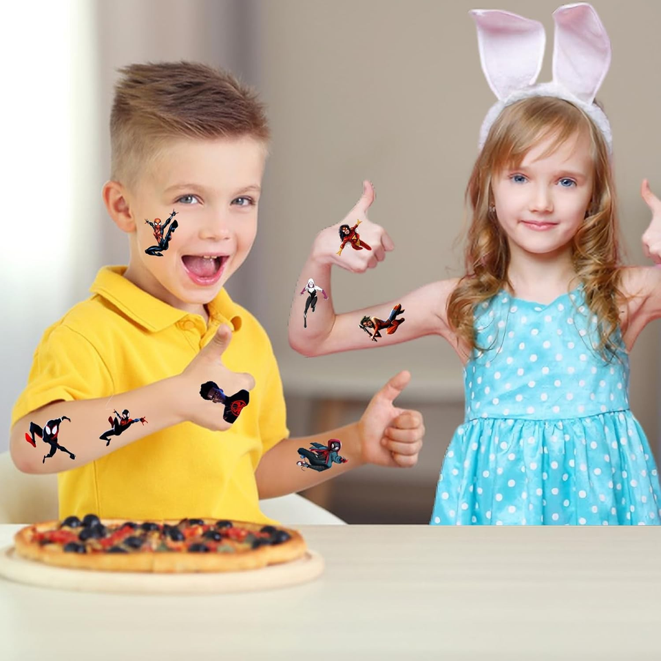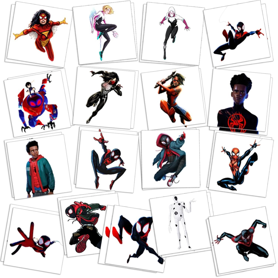 Theme Party Supplies: Miles Morales temporary tattoo stickers, including 32 patterns 128pcs total various cartoon characters, including all your favorite characters, with bright colors and cute designs.