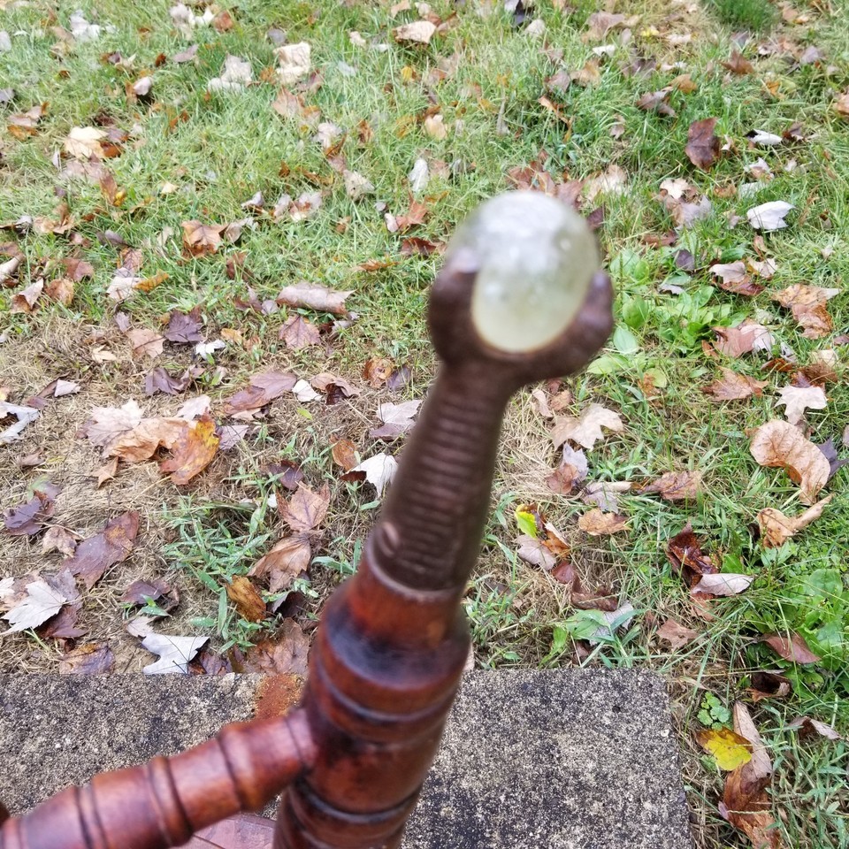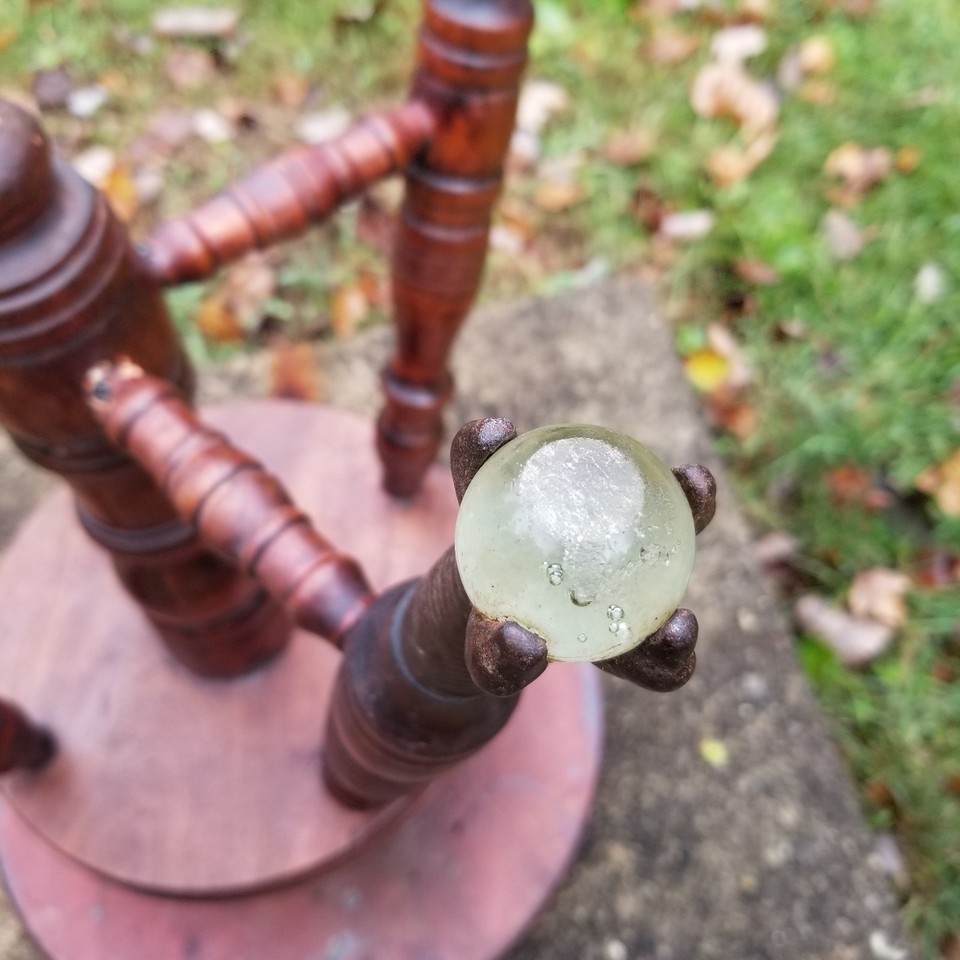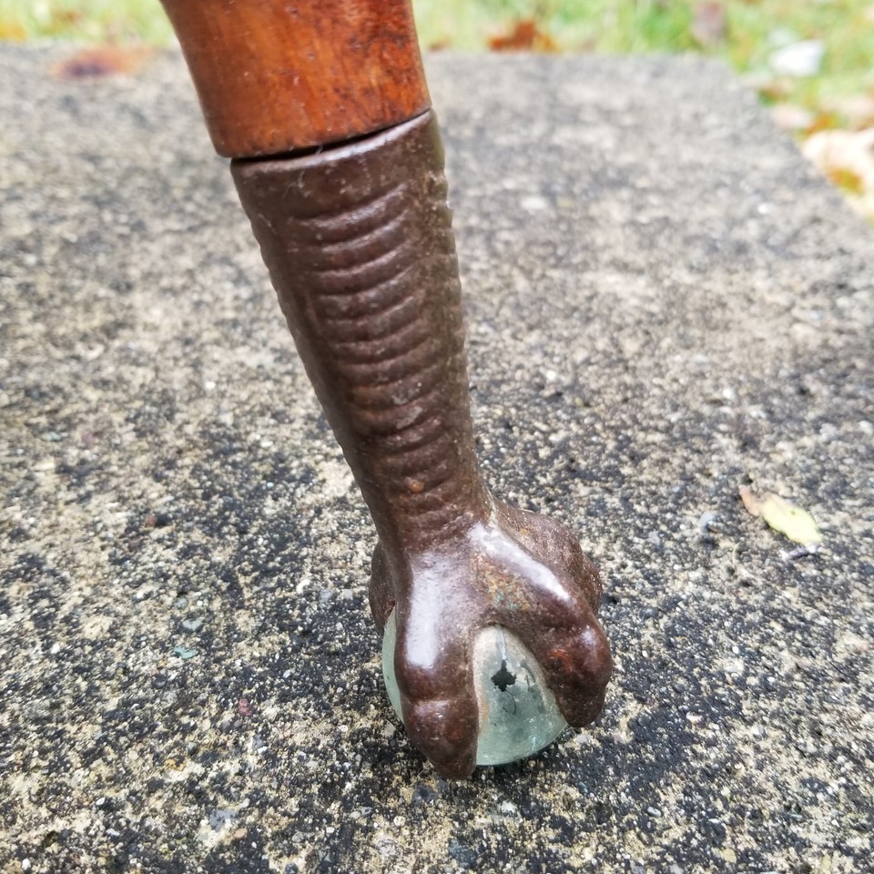 Really good shape for its age. One of the better if not best ones Ive seen on here. No cracks or chips in wood. Maybe minor scuffs. All cast iron claws are good. All glass balls are good with no cracks or major chips. Seat adjusts as it should. The top may have had a repair in the past as seen in pictures. Could use a little tightening here and there maybe if its going to be put to real use. USE YOUR BEST JUSDGEMENT.