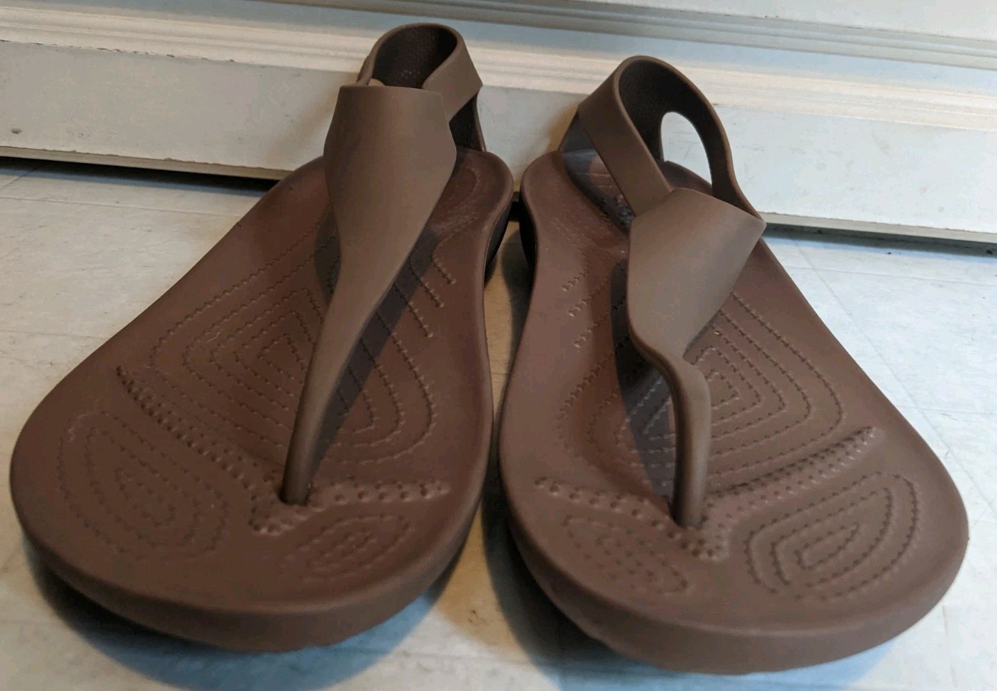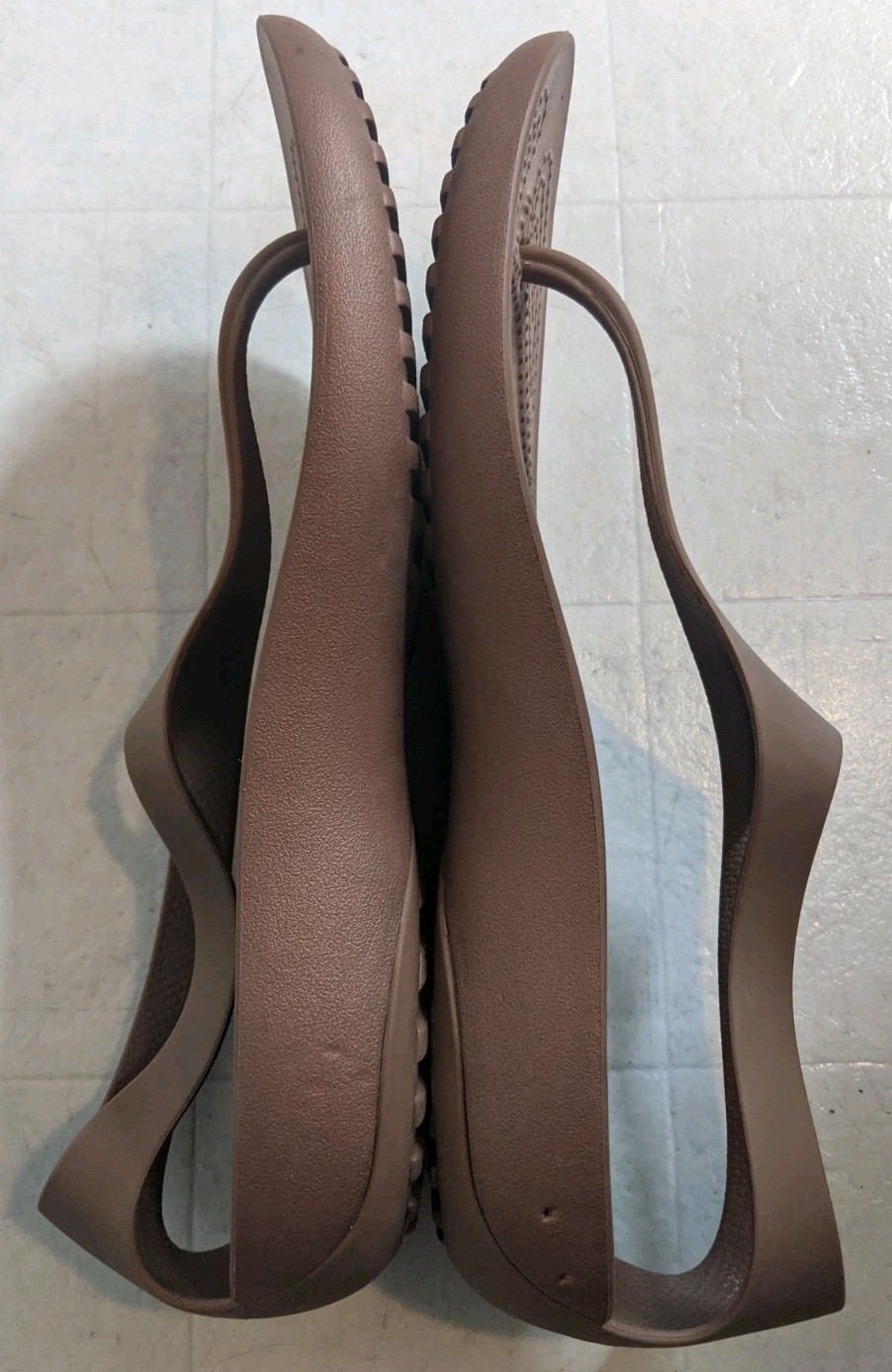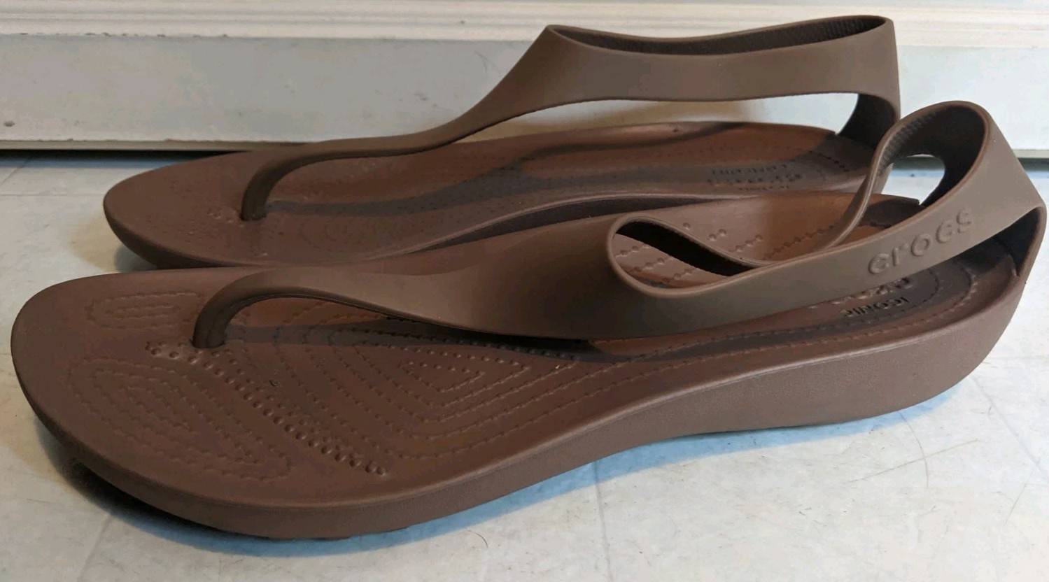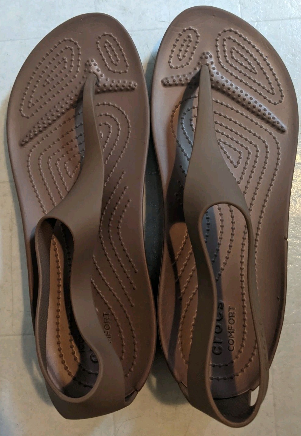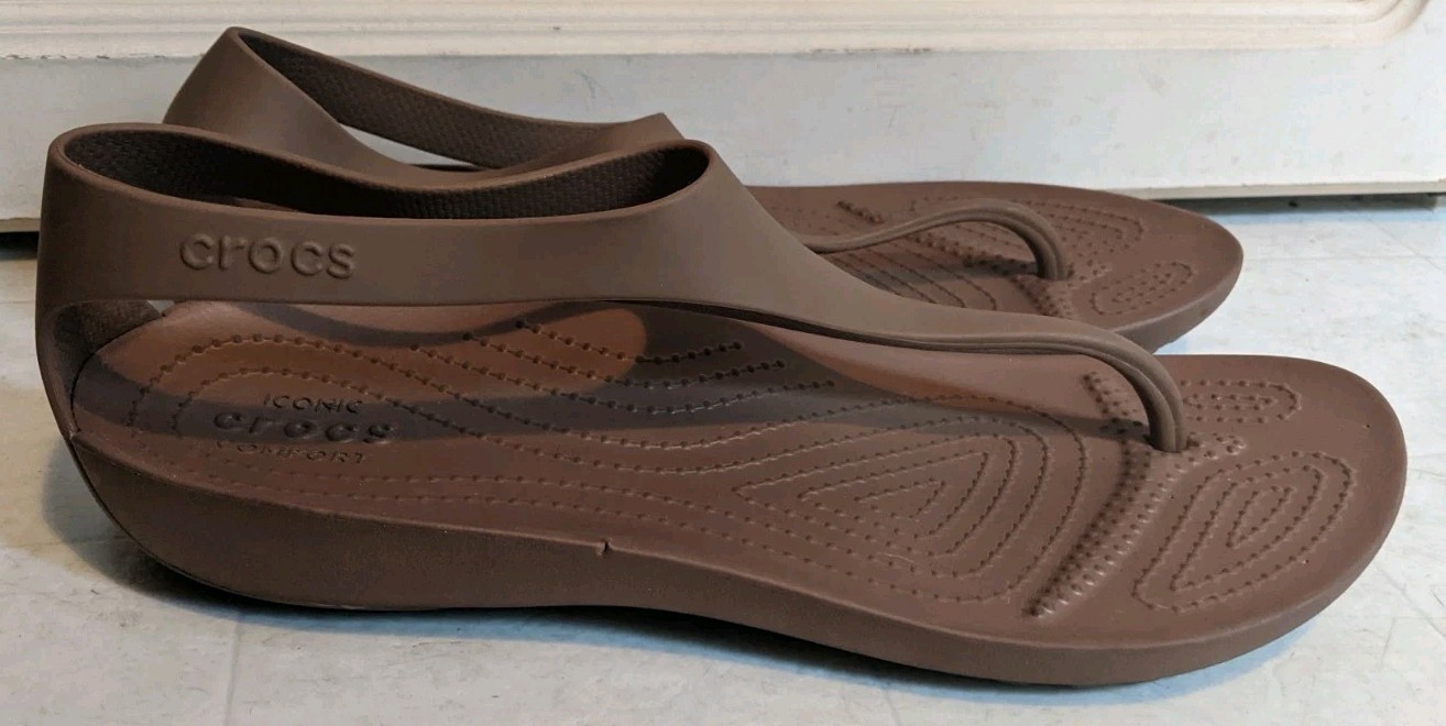 Slip into comfort and style with the Crocs Women's Serena Sexi Flip Flop Sandals. These size 9 thong sandals feature a sleek shiny brown hue and a classic solid pattern that complements any casual or activewear. Breathability and lightweight makes them the perfect choice for those warm summer days or a relaxed fall evening.