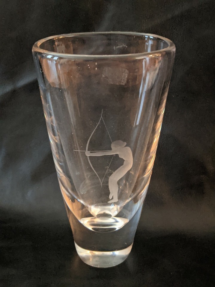 In vendita e un vaso di cristallo di piombo alto di Orrefors Palmqvist Vase Female Archer Sweden da 9 pollici inciso in perfette condizioni. Misurazioni: Altezza - 9 pollici Top - 4,5 pollici x 3 pollici In basso - 2.25 pollici x 2,25 pollici