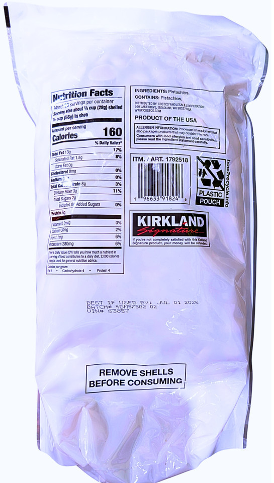 Kirkland Signature Roasted Unsalted Pistachios In-Shell 48 Ounce Bag EXP 07/2026