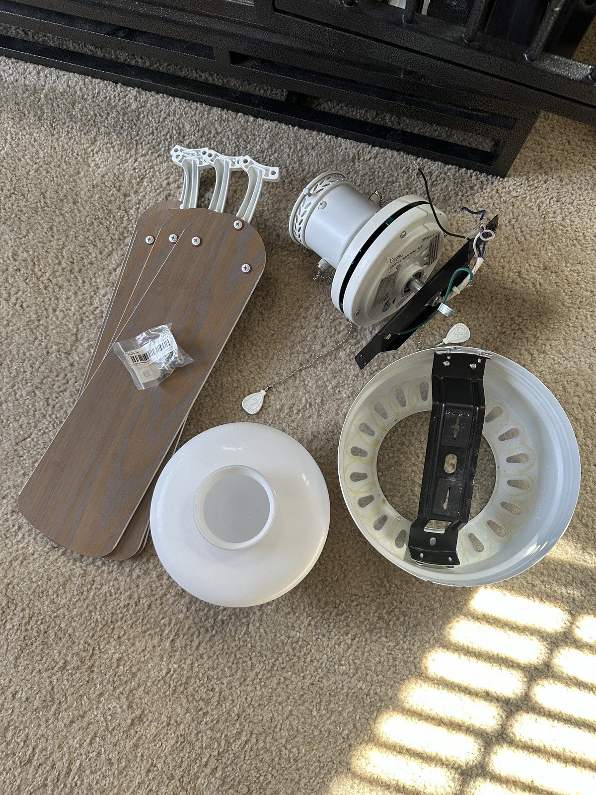 Great condition. Fully functioning. Fan can be controlled on a separate switch. Reversible fan blades. Hardware included. Only screws missing are the ones to mount the bracket to the ceiling. See photos.